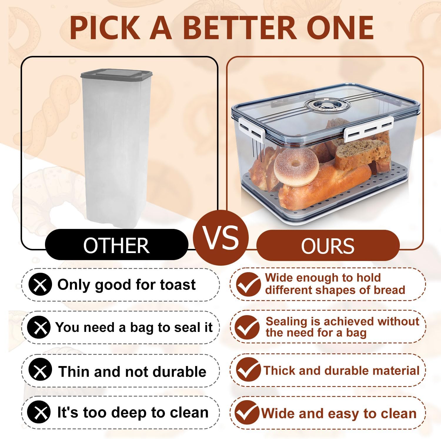 - Why Choose Us:Compared to the wooden breadbox,our bread storage container is easy to clean and the material of the bread keeper box will not get moldy after years.Compared with the long strip shape bread container,our bread storage box is wide and suitable for putting different shapes of bread.Our bread bin is sealed for resistant to moisture.Have an air valve on the bread box lid,optionally release hot bread airflow or seal against moisture