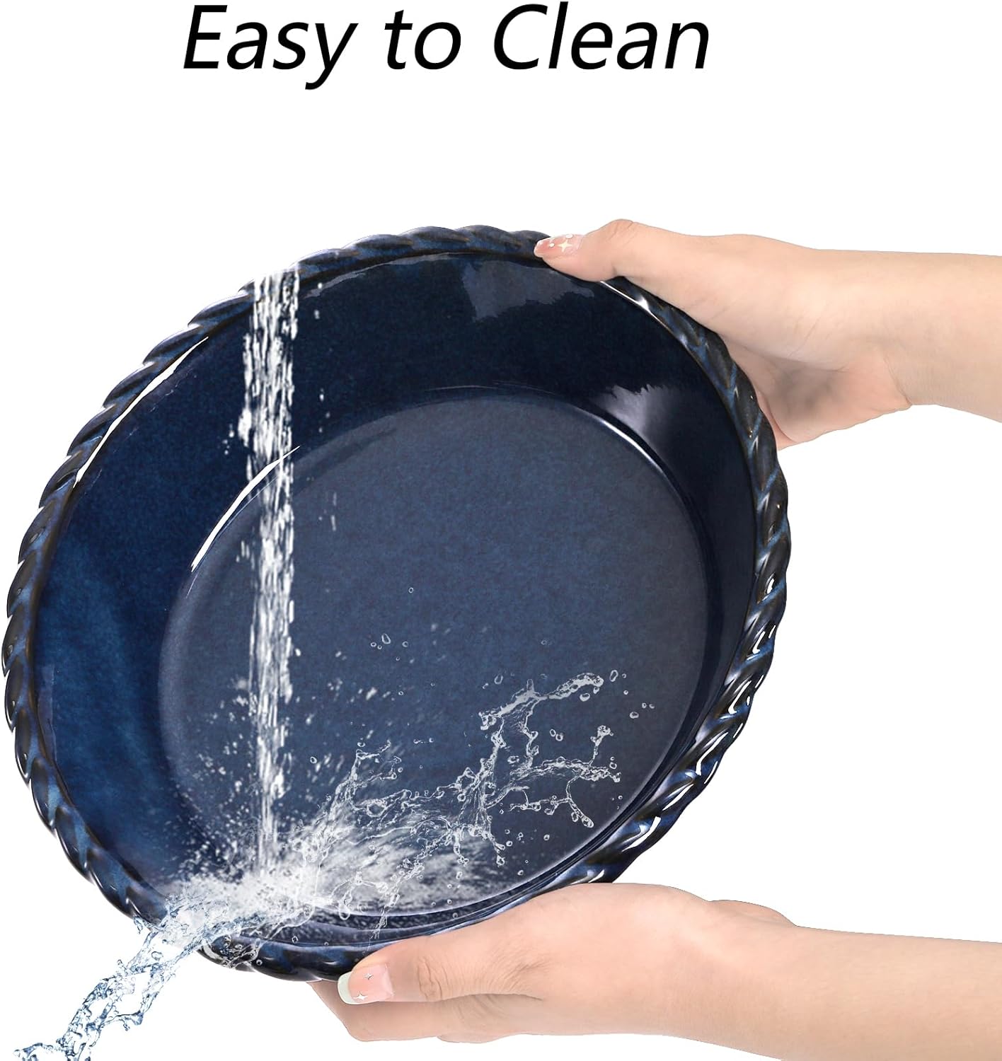 - Great Value Pack: You will get 2 pack dark blue ceramic pie pans with the inside measuring 9.7 inches wide and 2.6 inches deep. The normal capacity is approx 54 ounce. Deeper design and larger capacity allow you share more happiness with your family