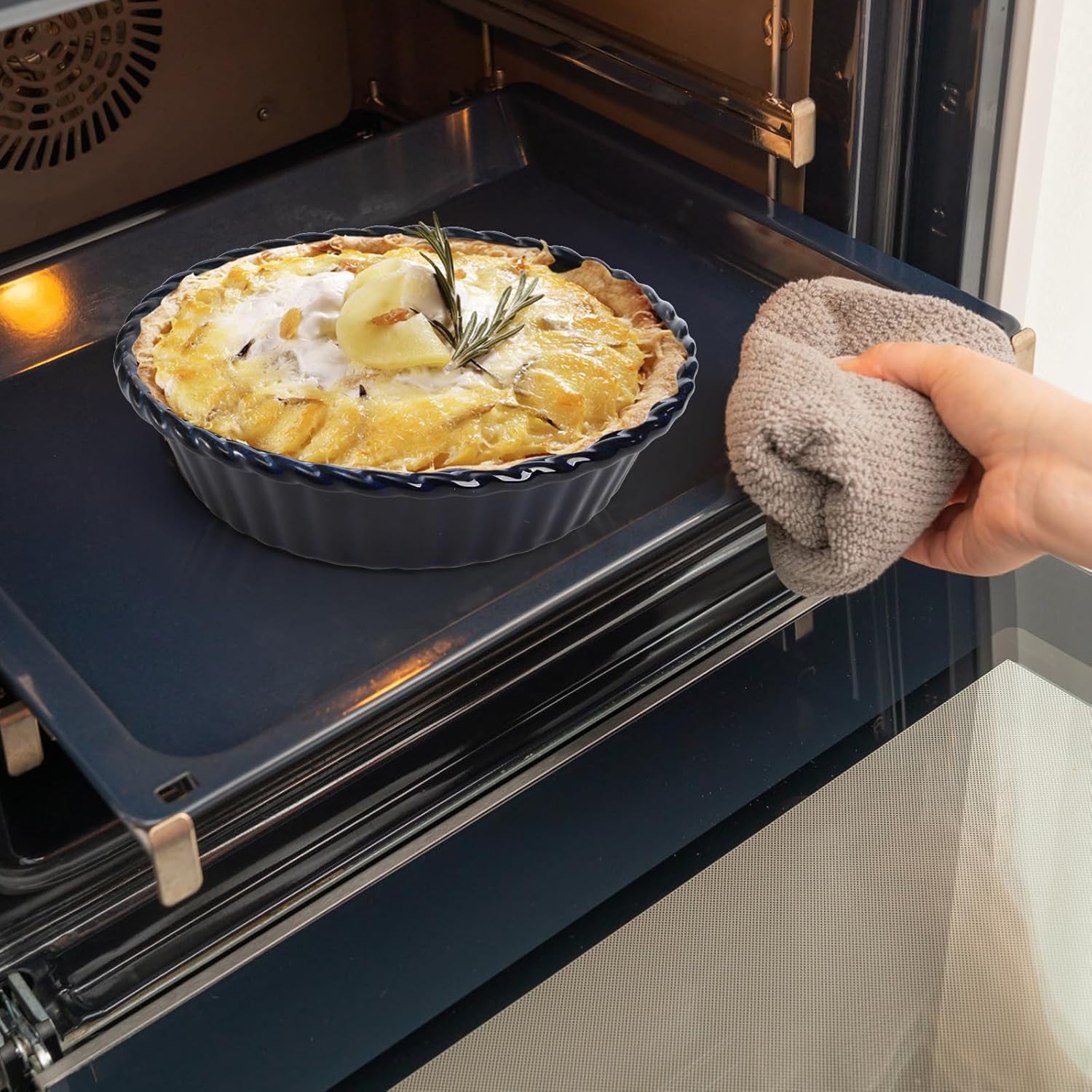 - Easy to Clean: Smooth glaze makes cleanup a breeze, easy to clean in dishwasher or hand wash with soap and water. Microwave and oven safe. NOTE: Please use the anti-hot gloves (excludes) to take the baking pans out when it is still hot