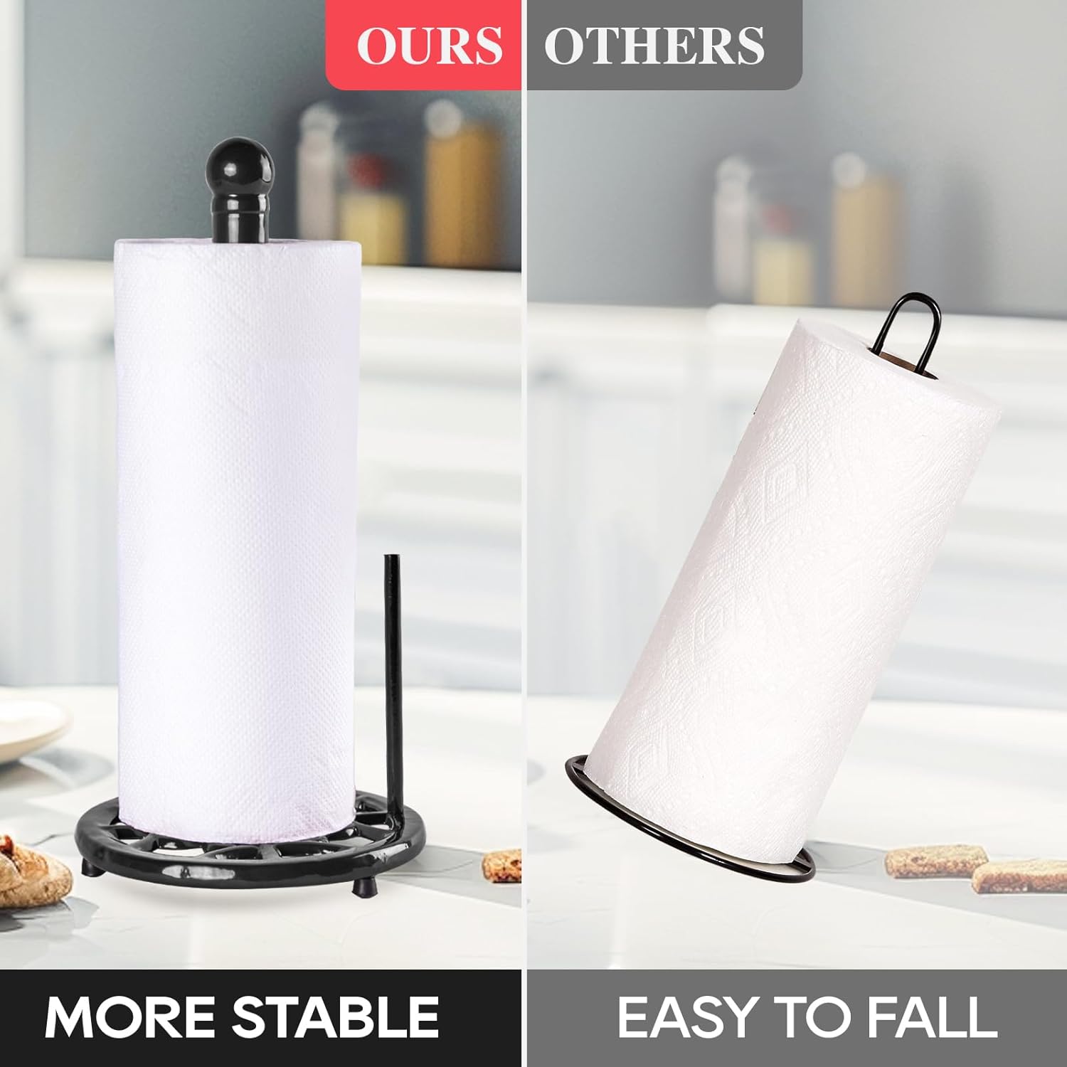 - Easy to Load & Tear: Freestanding paper towel holder accommodates any size or brand of paper towels. Loading the Holder is easy. Carefully engineered for tear roll paper. Heavy paper towel holder doesn't move when a paper towel is torn off