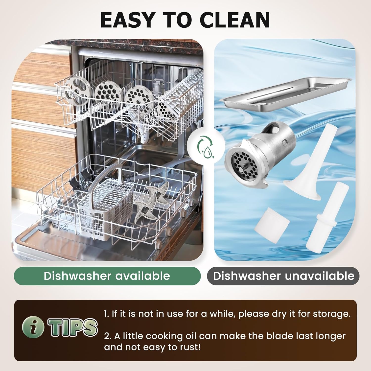 - [Easy cleaning] This stainless steel meat grinder is designed for convenience and hygiene. All parts are fully detachable for easy cleaning, and the blades and cutting plates are dishwasher safe for even simpler cleanup