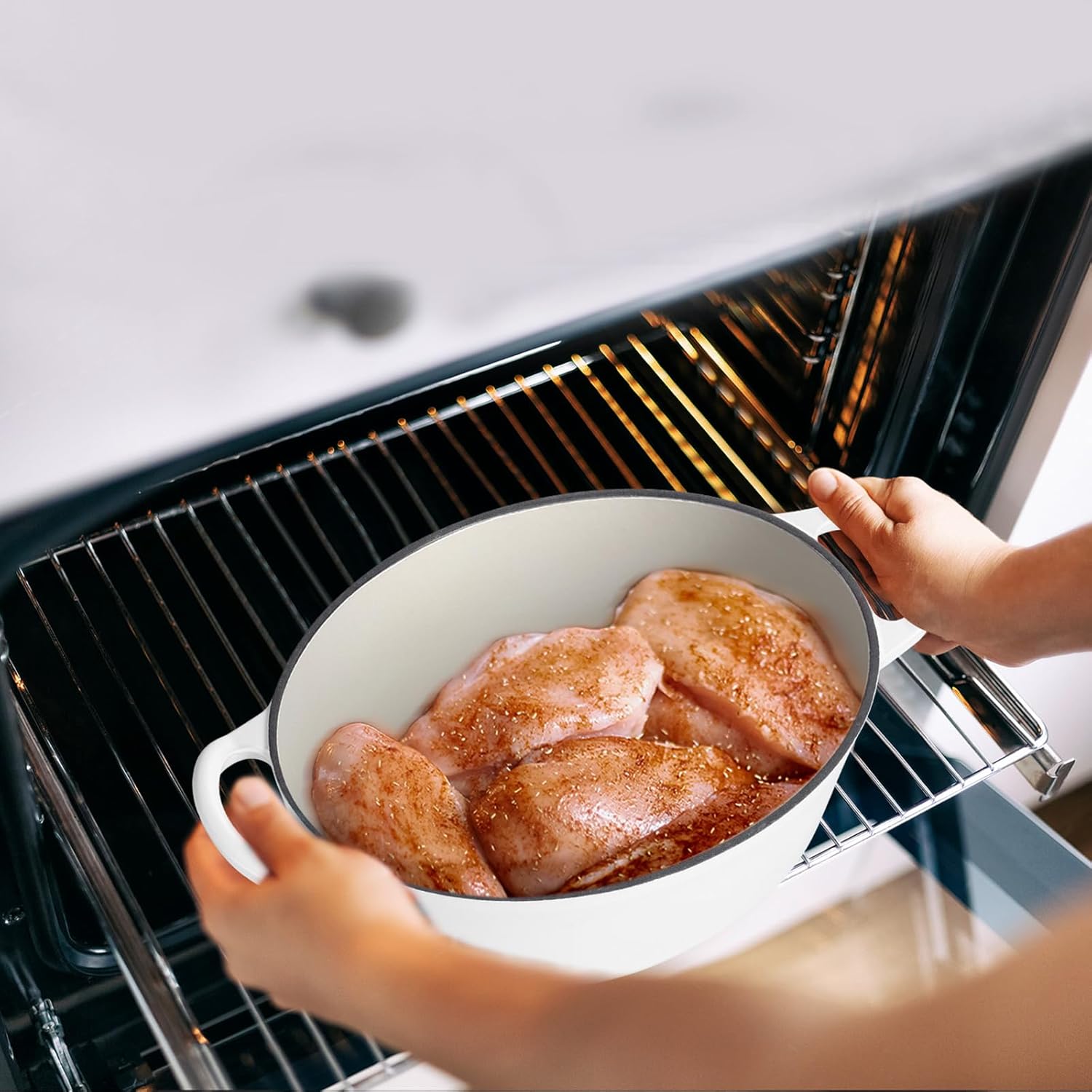 - Superior Heat Retention, our Dutch oven for bread baking ensure even heat distribution and retention, evenly heating throughout both the bottom and sidewalls, oval Dutch oven also reduces the amount of energy needed for cooking, ensuring perfect roasts, stews and baked bread every time. Oven Safe up to 500℉