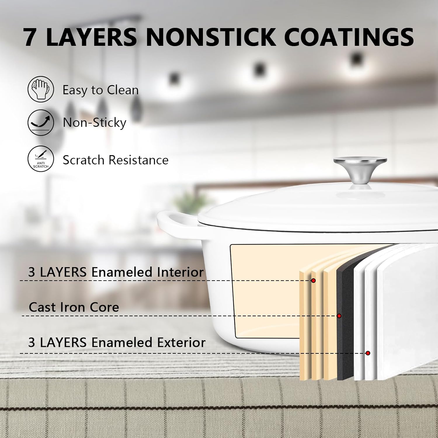 - Heavy Duty Material, Dutch oven pot with lid is made of 6 layers enamel and cast iron core layer, 4mm thickness pot wall with one-piece molding design enhance the strong construction without cracks or chips, high gloss enamel surface with no chemicals, form a layer of smooth coating to keep away from rusting and reduce food sticking