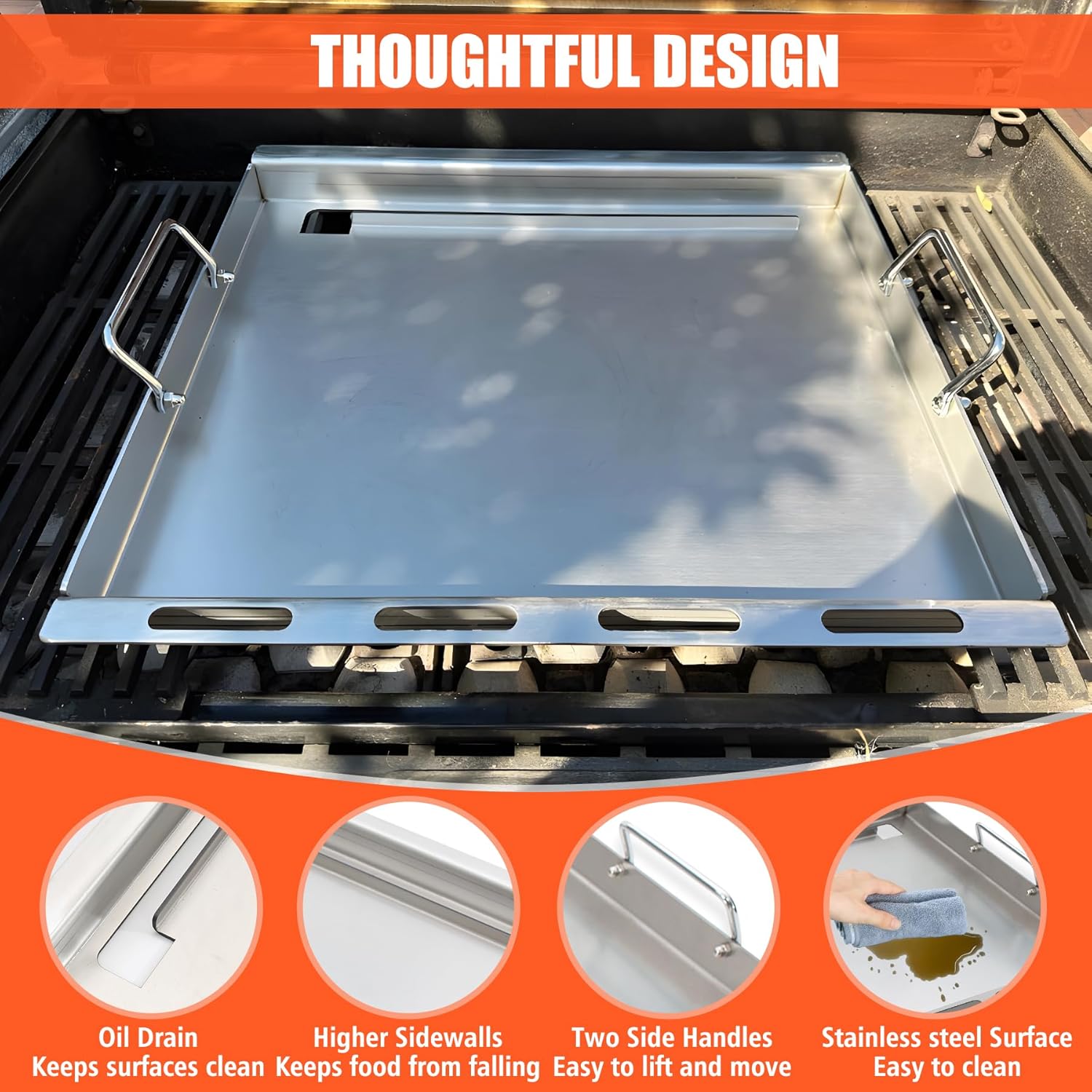 - STURDY & DURABLE: The griddle for gas grill is made of 304 food grade stainless steel to ensure durability. It will not chip or rust easily, and will not warp or deform when used for long periods of time at high temperatures, lasting even longer than the original iron plate