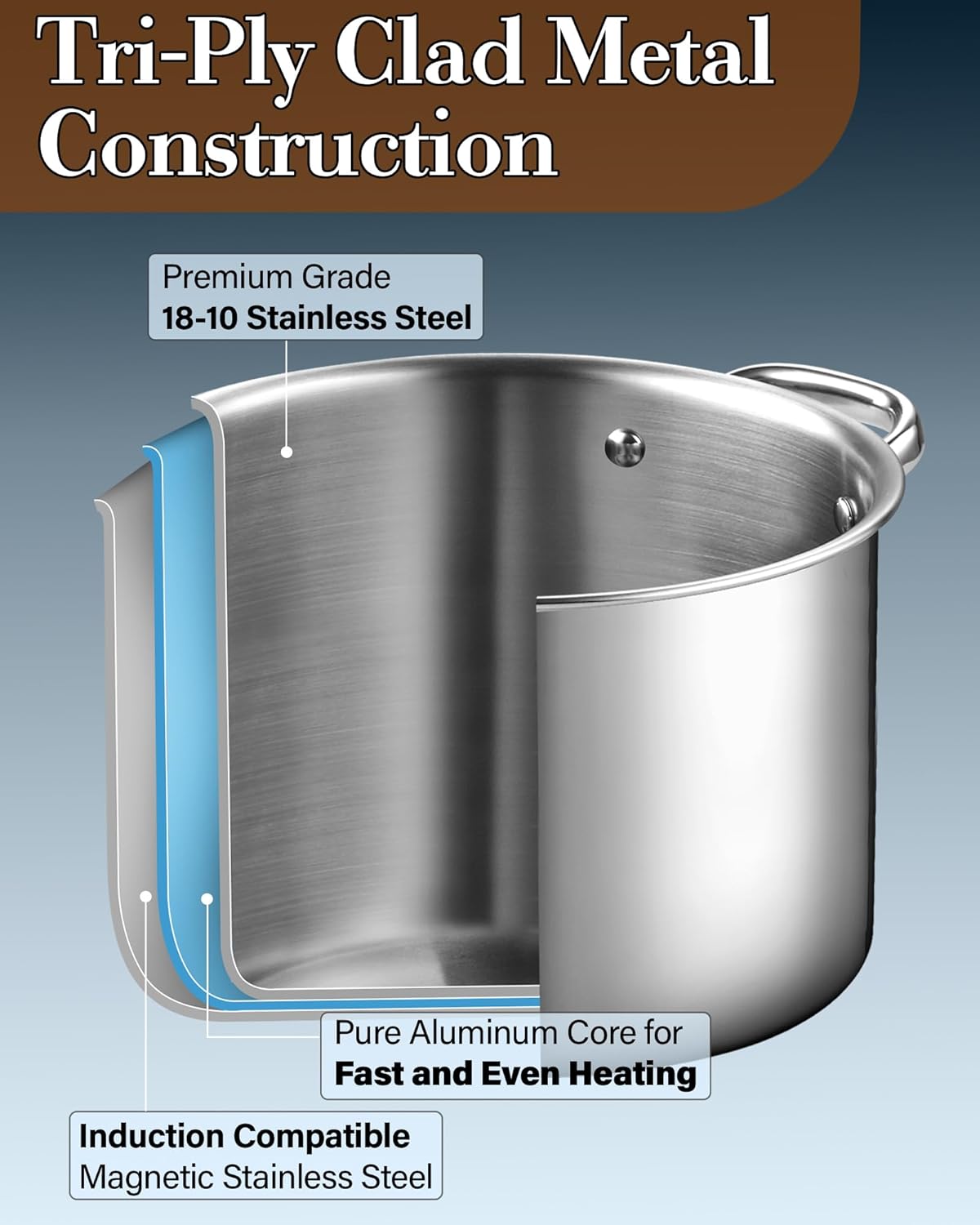- Tri Ply Clad: 6 quart stockpot is made of 18/10 stainless steel, aluminum and a metal outer layer, which ensures good thermal conductivity and even heat distribution, helping food heat up quickly and evenly