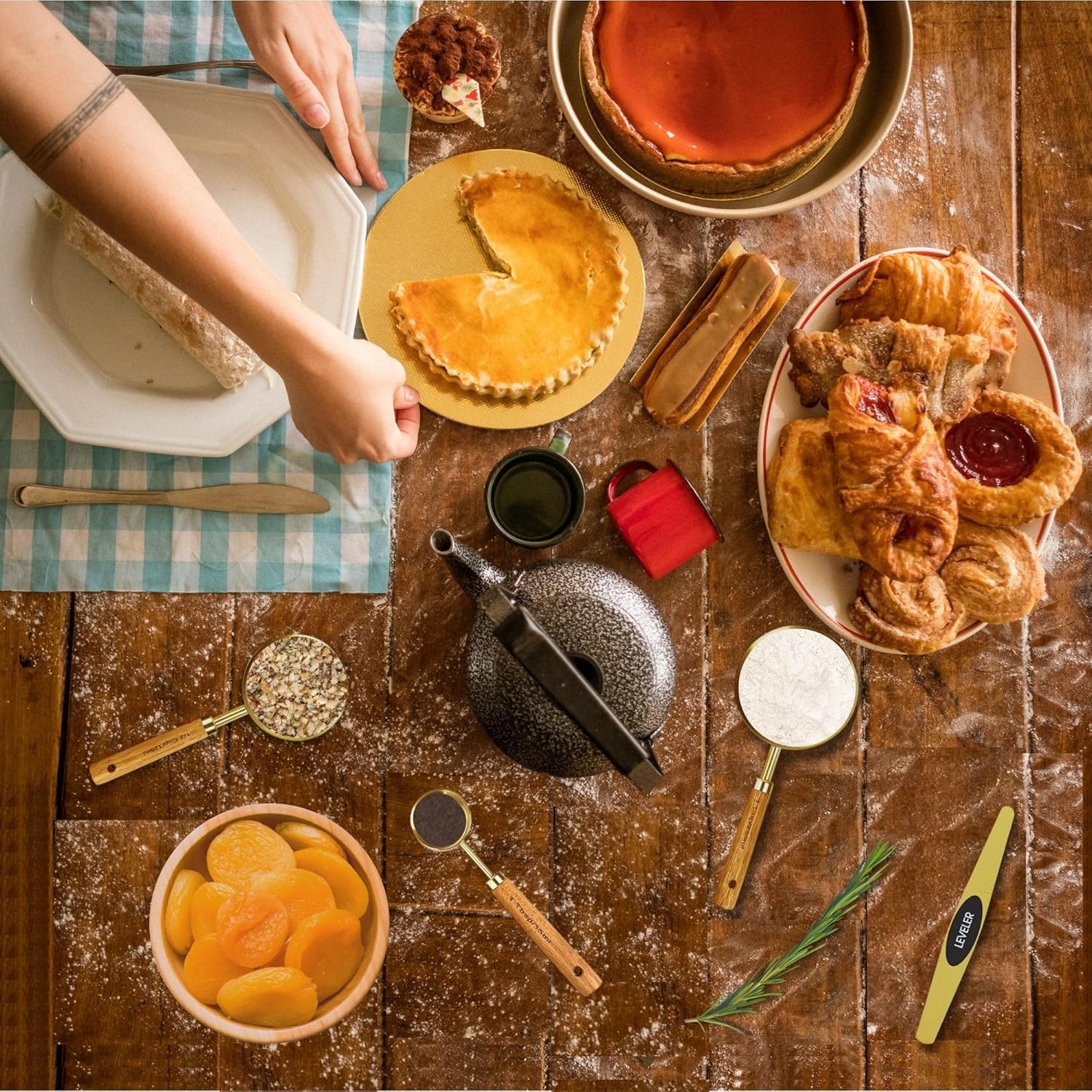 - [9-Piece Measuring Set with Leveler] - Includes 4 measuring cups (¼, ⅓, ½, 1 cup), 4 measuring spoons (¼ tsp, ½ tsp, 1 tsp, 1 tbsp), and a gold magnetic leveler — perfect for baking, cooking, and meal prep with precision.