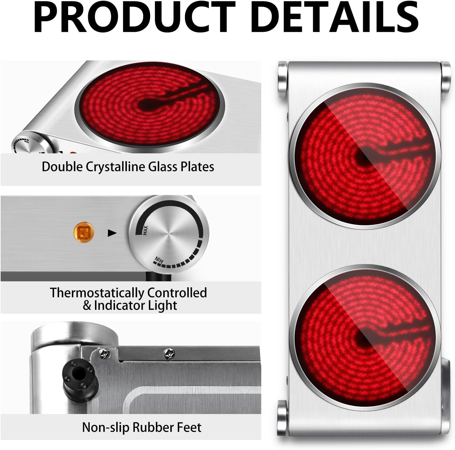 Double Burner, CUSIMAX Electric Burner 1800W Ceramic Hot Plate for Cooking, Glass Plate Infrared Burner, Portable Dual Control Electric Cooktop, Stainless Steel-Upgraded Version