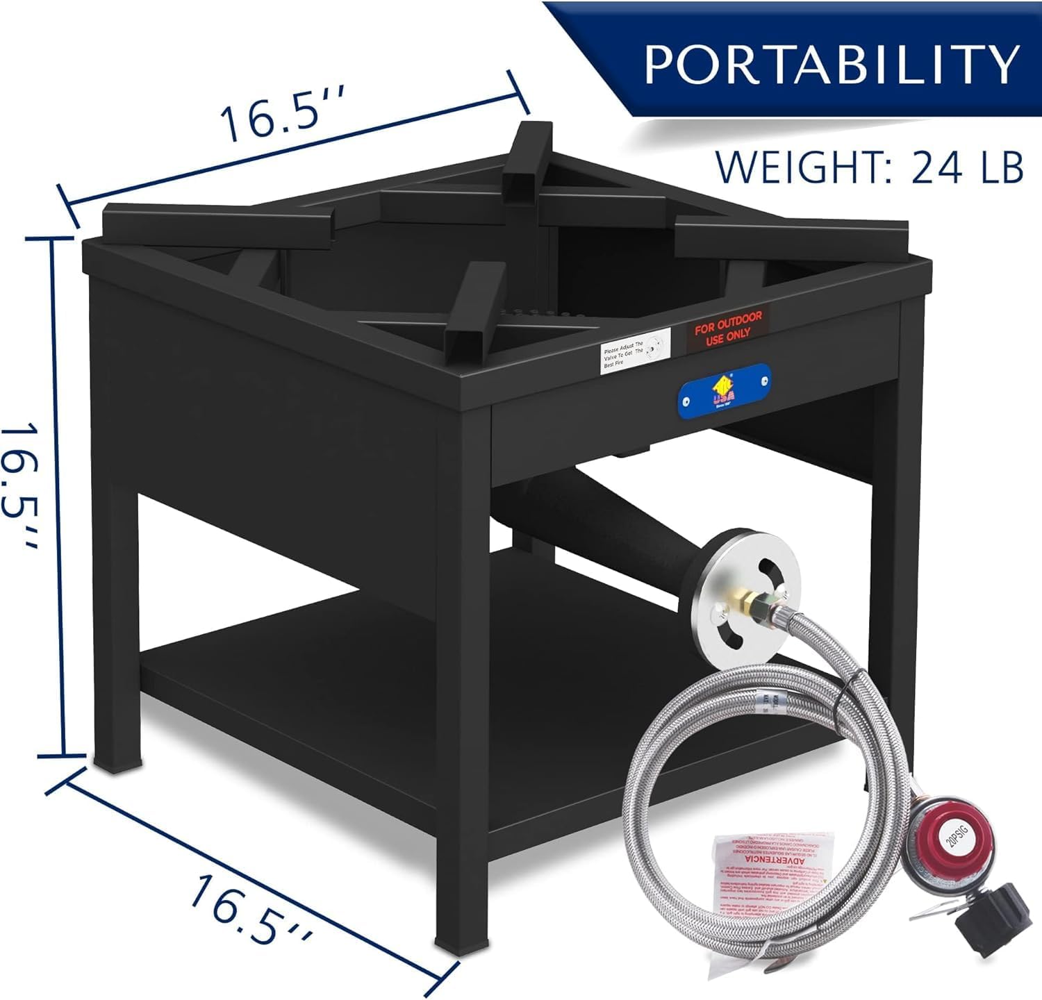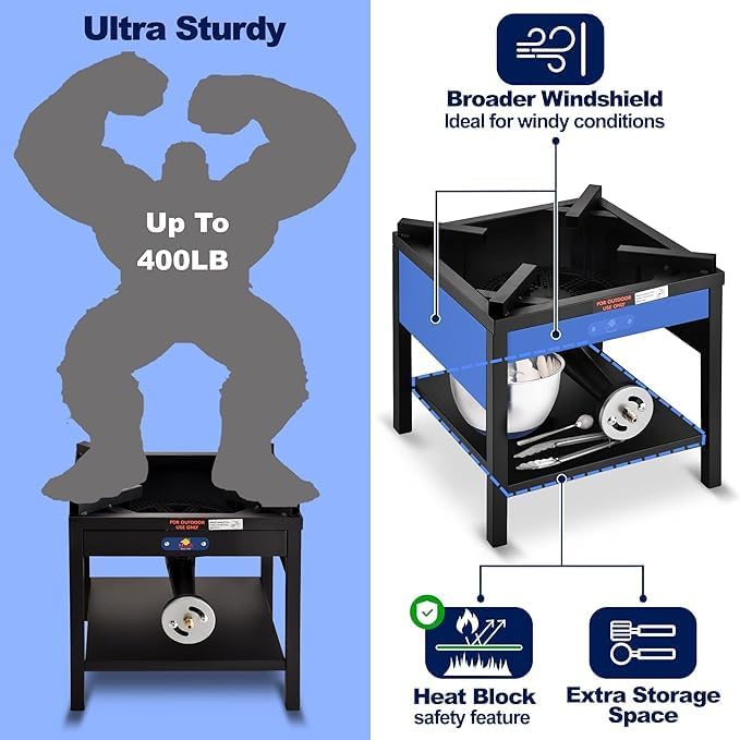- Hight-Heat Output: ARC Single burner propane stove has a Heavy-Duty Square Stove with 200,000BTU high heat output.16.5" * 16.5" large cooking area, suitable for different cookware: barbecue grills, turkey fryer pots or tamale steamer, etc.