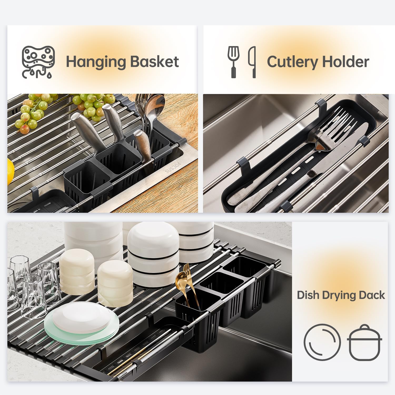 - Extensible Design: The length of the over sink dish drying rack can be adjusted according to your needs. The rack size is adjustable from 12.7 to 22.8" (length) x 15.3"(width).The roll-up dish drying rack is suitable for most sink sizes, but it is better to confirm the size of the sink before purchasing.It's sturdy and easy to clean, making it ideal for drying fruit, spoons, dishes, vegetables, etc.