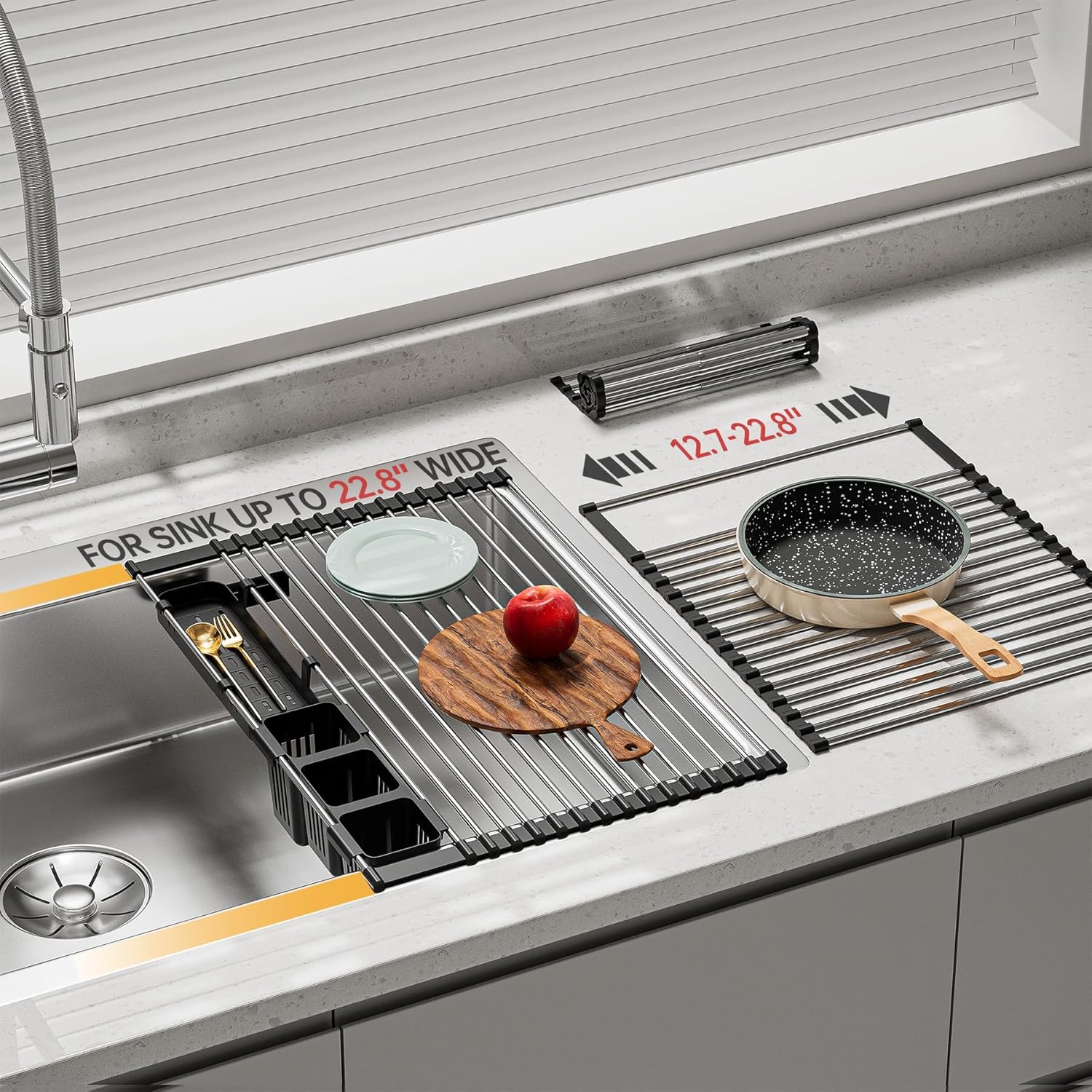 - SPACE SAVING, FOLDABLE DESIGN: Just 10s to easily roll it up for storage and help you organize your kitchen.Works great and keeps the kitchen sink area looking neat, the best one of dish drainers for the kitchen counter. This design not only saves space but is also easy to clean. The silicone surface just needs a rag to wipe clean. A great addition as a kitchen sink organizer and an apartment must-have. It will be a warm gift for a new home.