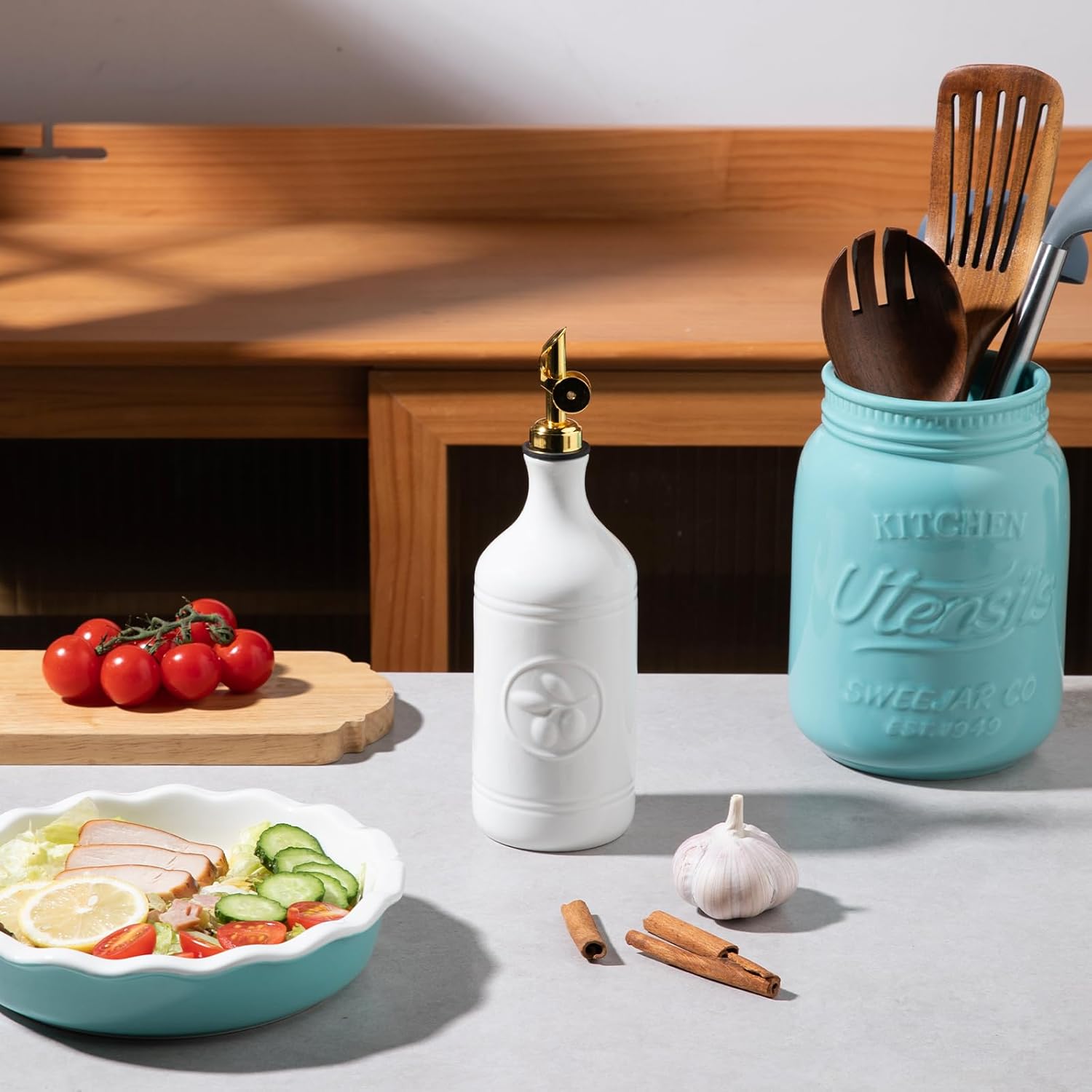 Sweejar 16 Oz Ceramic Olive Oil Dispenser Bottle, Oil Dispenser for Kitchen with Gravity Spout, Relief Opaque Oil Container for Evoo, Avocado Oil, Vinegar, Soy Sauce, 1 Pack(White, Gold Spout)
