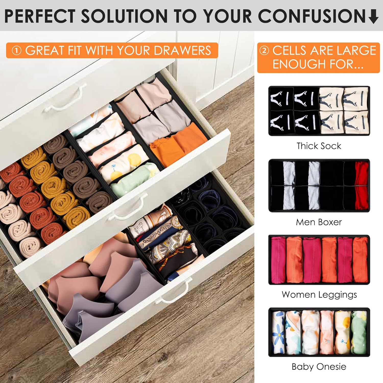 - ăCOMPARTMENTS FOR MULTI STORAGE USEăCompared to others, our 8 pack drawer organizer set has 5 sizes for various storage needs. No matter it's knee sock, men boxer brief, or women leggings, they will all perfectly fit into our clothes organizer. Great for bedroom organization and dorm room storage.
