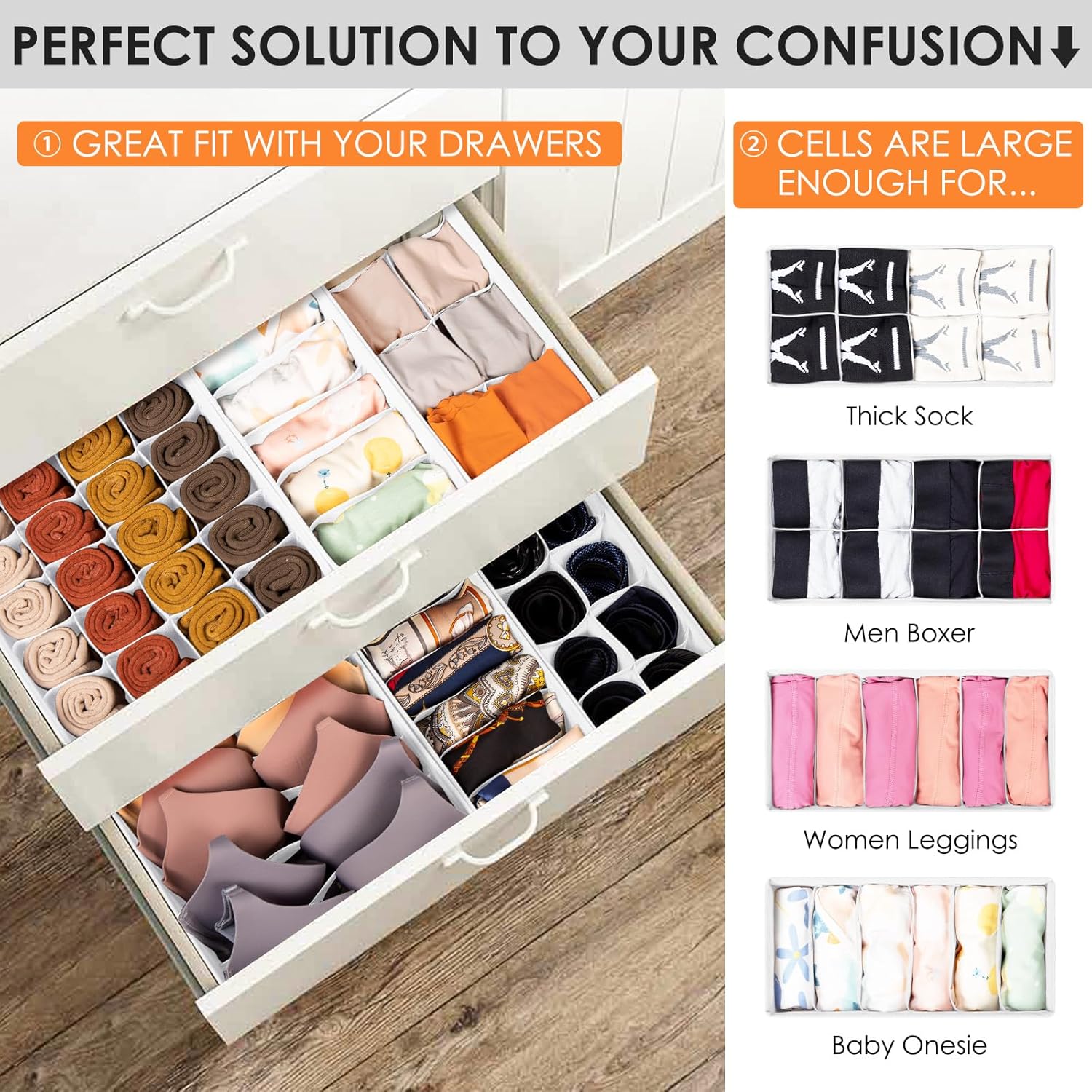 - ăCOMPARTMENTS FOR MULTI STORAGE USEăCompared to others, our 8 pack drawer organizer set has 5 sizes for various storage needs. No matter it's knee sock, men boxer brief, or women leggings, they will all perfectly fit into our clothes organizer. Great for bedroom organization and dorm room storage.