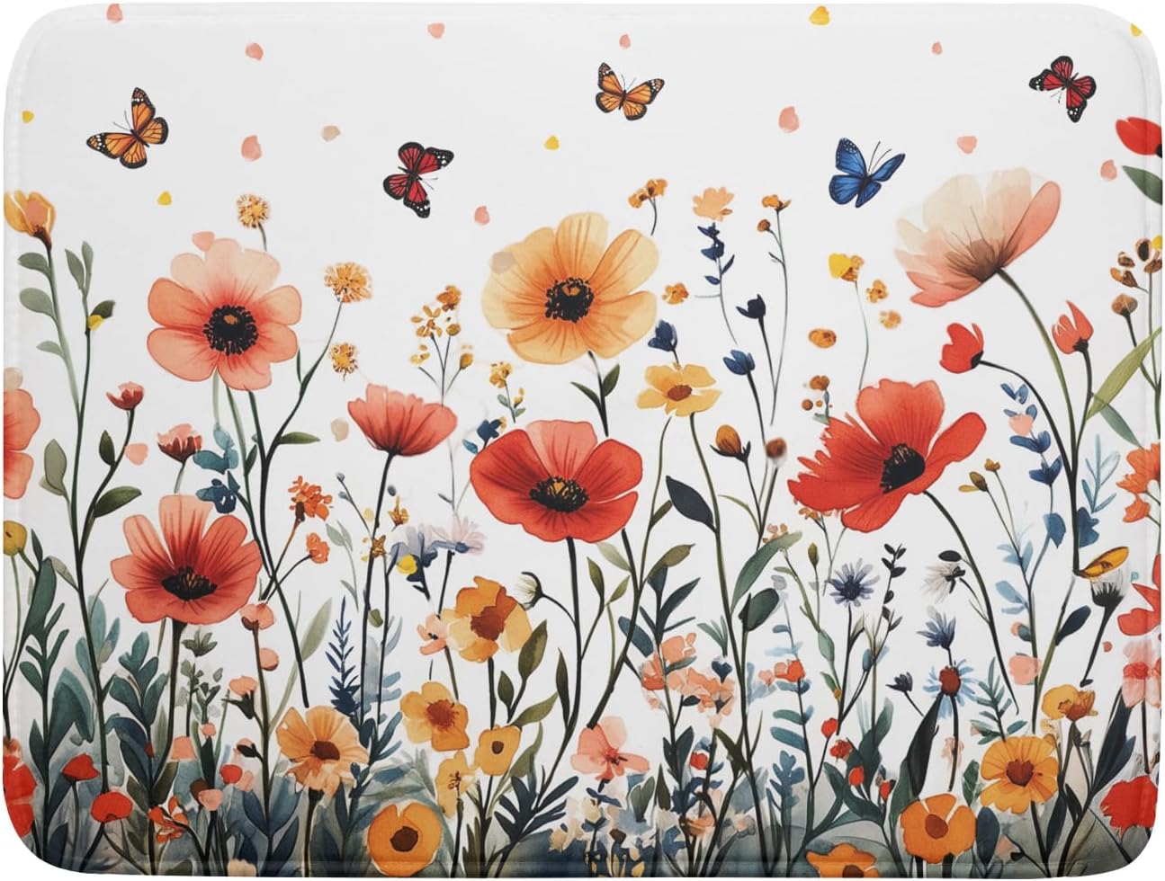 Poppy Flower Dish Drying Mat 18x24 Inch Floral Leaves Dish Drainer Protector Pad Washable Reversible Drying Pad for Kitchen Counter Sink