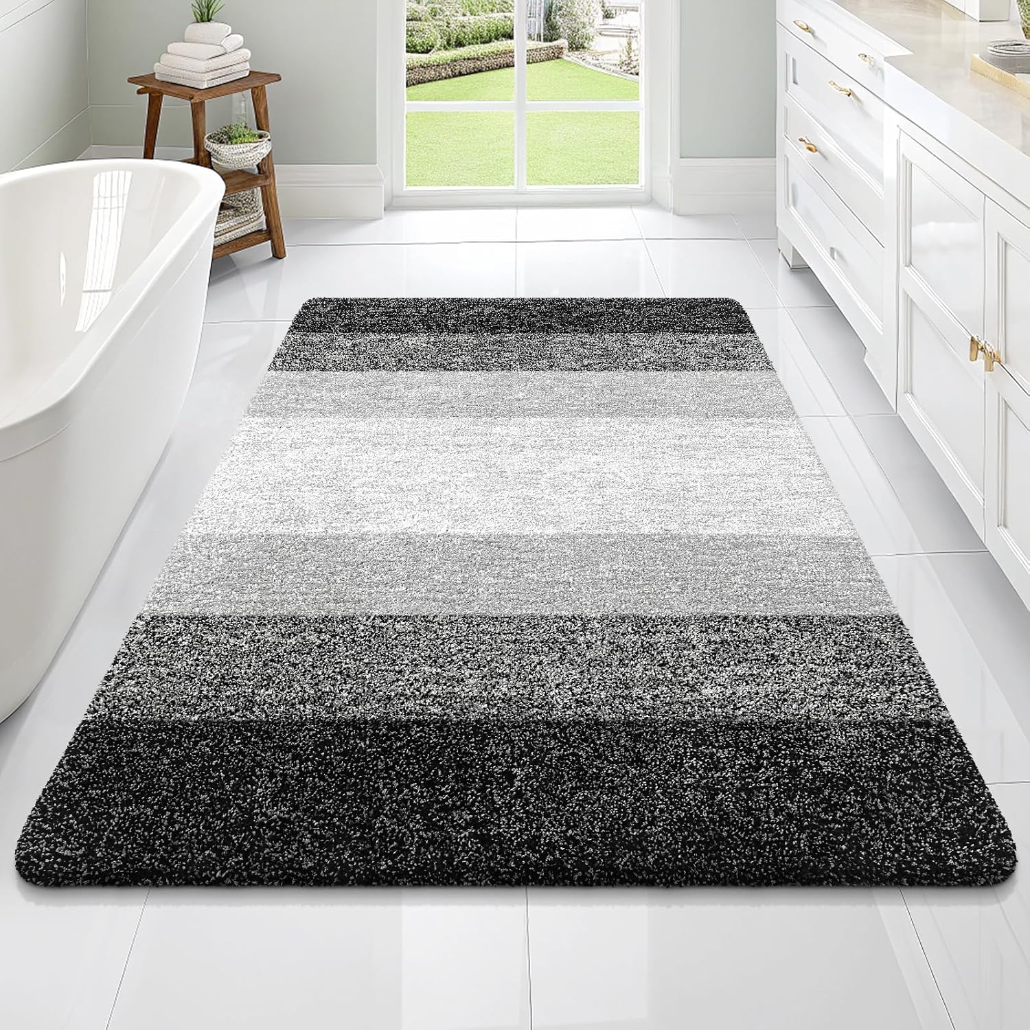 - [Luxuriate in Pure Comfort] Indulge your feet in the softest, coziest microfiber imaginable. With its plush pile, nearly one inch thick, our bath mat soothes and warms your feet, protecting them from the cold floor below. Enhance your bathroom decor with OLANLY's captivating bath mat. The gradient color stripe design seamlessly merges stripes, creating an eye-catching pattern that infuses sophistication into your space.