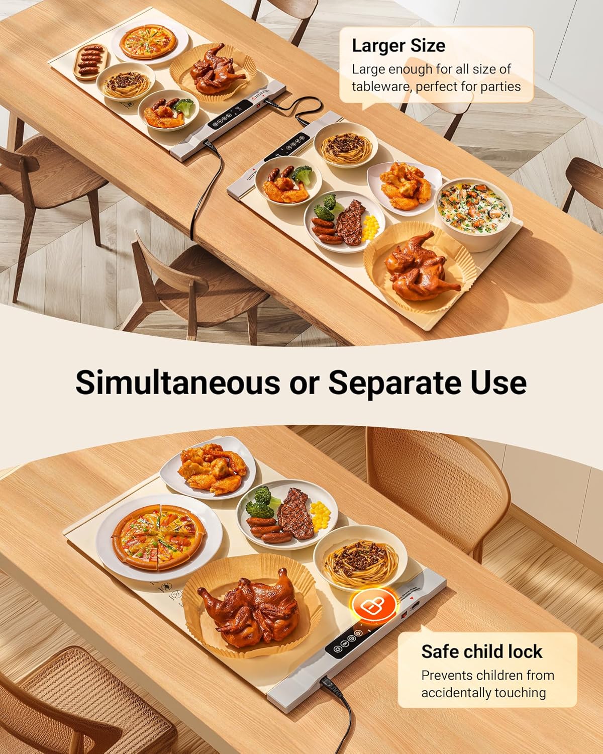 - 2 Pack, Large Heating Surface - The package comes with 2 pack of food warming mat and parallel connection cable, enabling you to use 2 mats at the same time with only 1 power cord, which greatly increase the heating surface to heat more dishes. Also comes with 2 power cords so that you can use them separately.