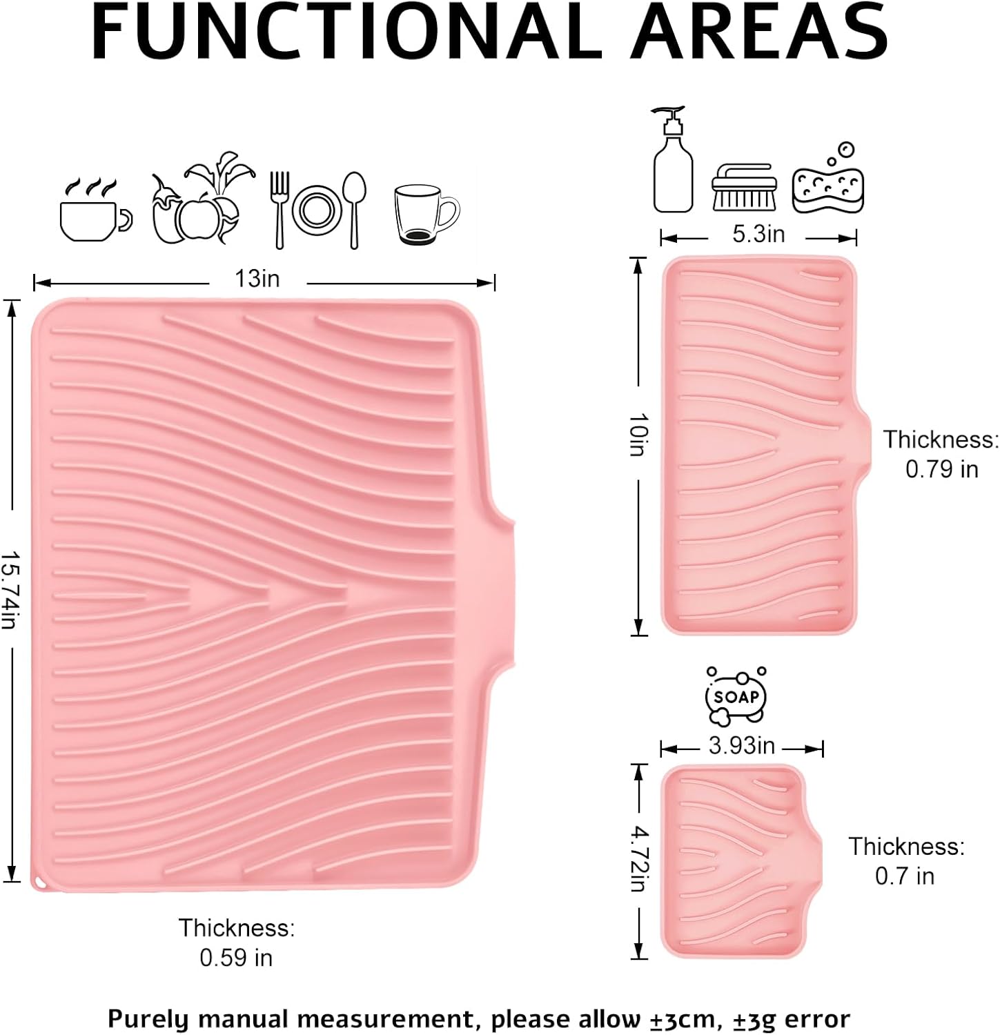 Silicone Dish Drying Mat for Kitchen Counter, Dish Drying Pad, Non-Slip Drain Pad with Built-in Drain, Heat Resistant Stone Drying Mat, 3 pcs (Pink)