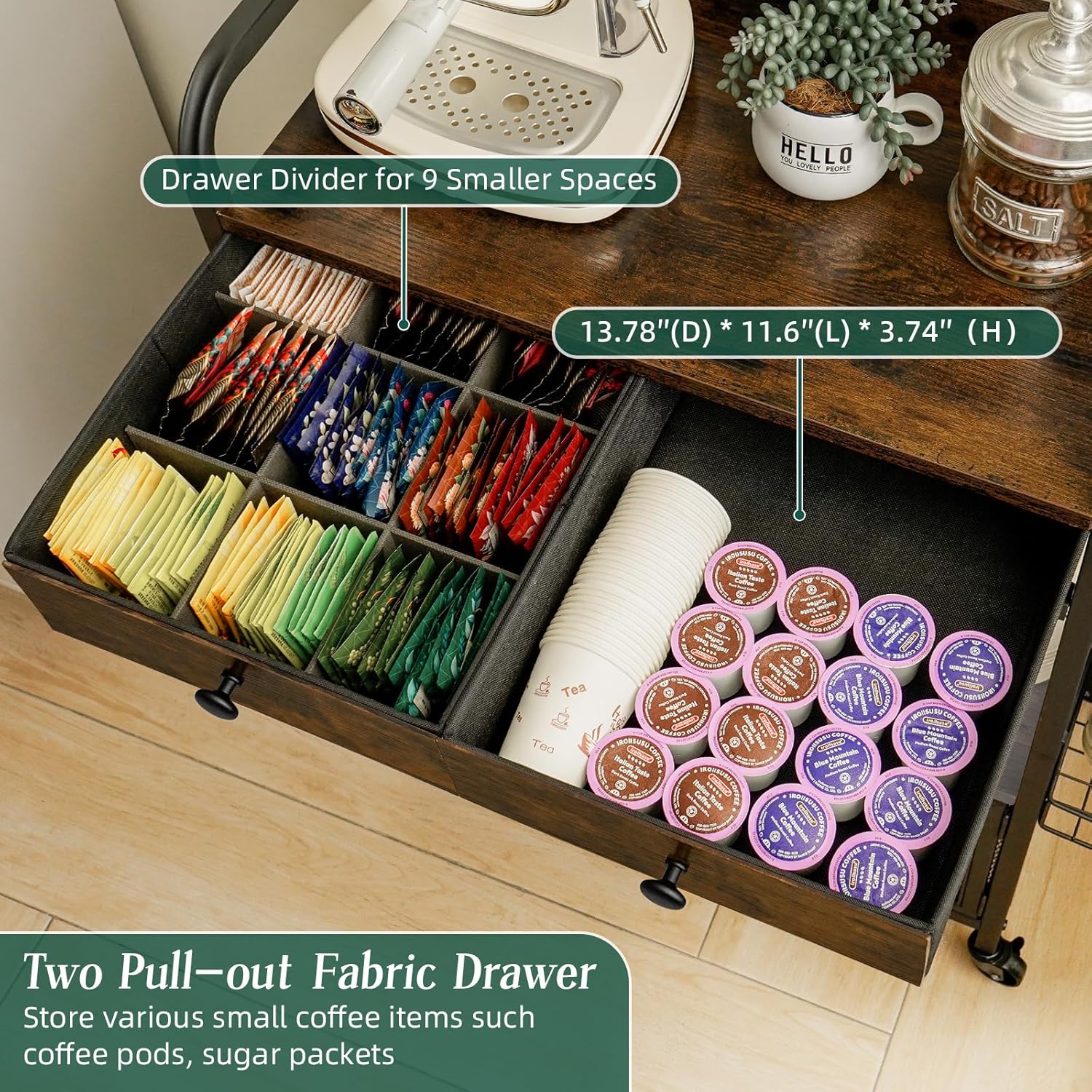 - Two Pull-out Fabric Drawer for Coffee Bar Cabinet: One drawer has dividers, creating 9 small compartments for neatly organizing coffee packets, sugar packets, tea bags, creamers, and other bagged items. The other drawer, without dividers, is providing large storage for disposable cups, coffee pods, coasters, or long spoons to suit your daily needs