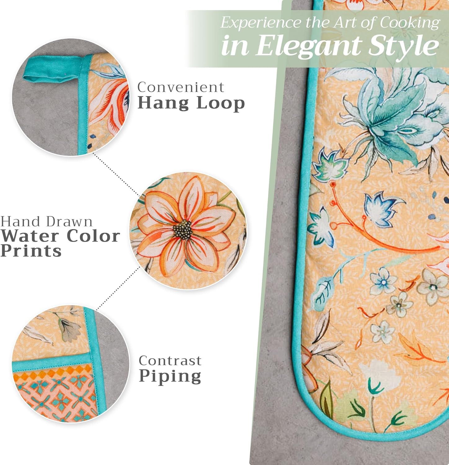 - Package includes: Includes 1 double oven mitt sized 7"x35". Perfect for handling hot cookware safely while adding a touch of European elegance to your kitchen. Designed in Europe and made in India with care