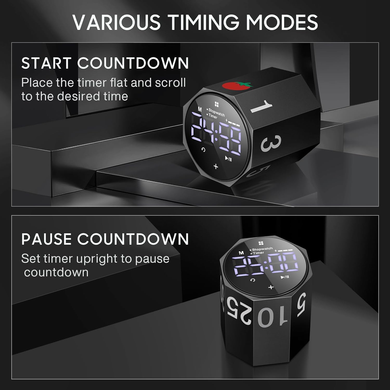 - 【7 timing modes】Productivity timer can set stopwatch and timer modes. The countdown mode has 7 preset durations (1/3/5/10/25/30/60 minutes) and a tomato time. Just roll it gently to start the timer, and lay it flat to pause it. In addition, you can customize any time to meet your needs, allowing you to efficiently manage your time throughout the day.