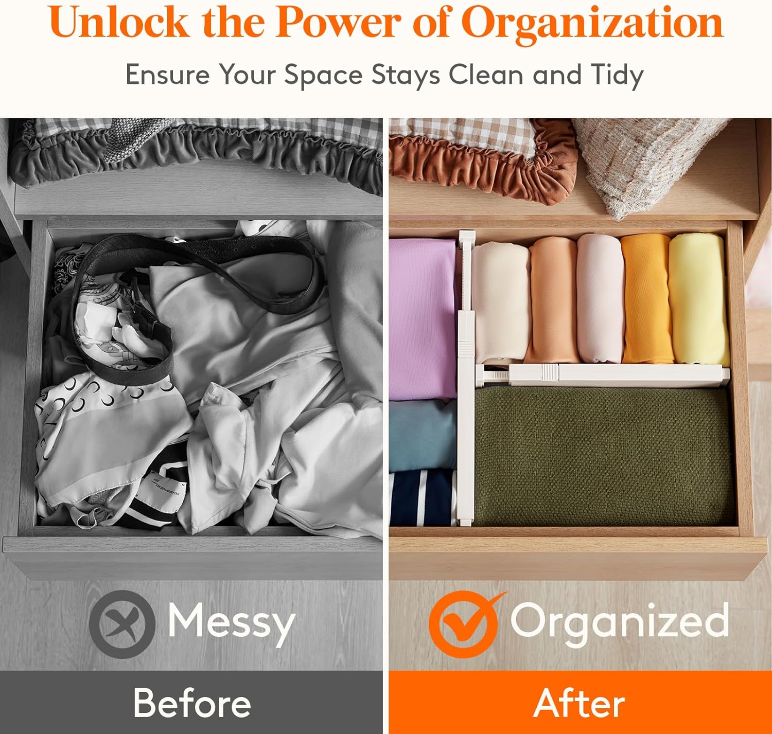 - Premium Material: Our drawer organizers for clothing are made of sturdy ABS material and include high-quality EVA foam sponges on both ends to prevent any scratches or damage to your drawer’s inner walls, leaving no trace or residue behind