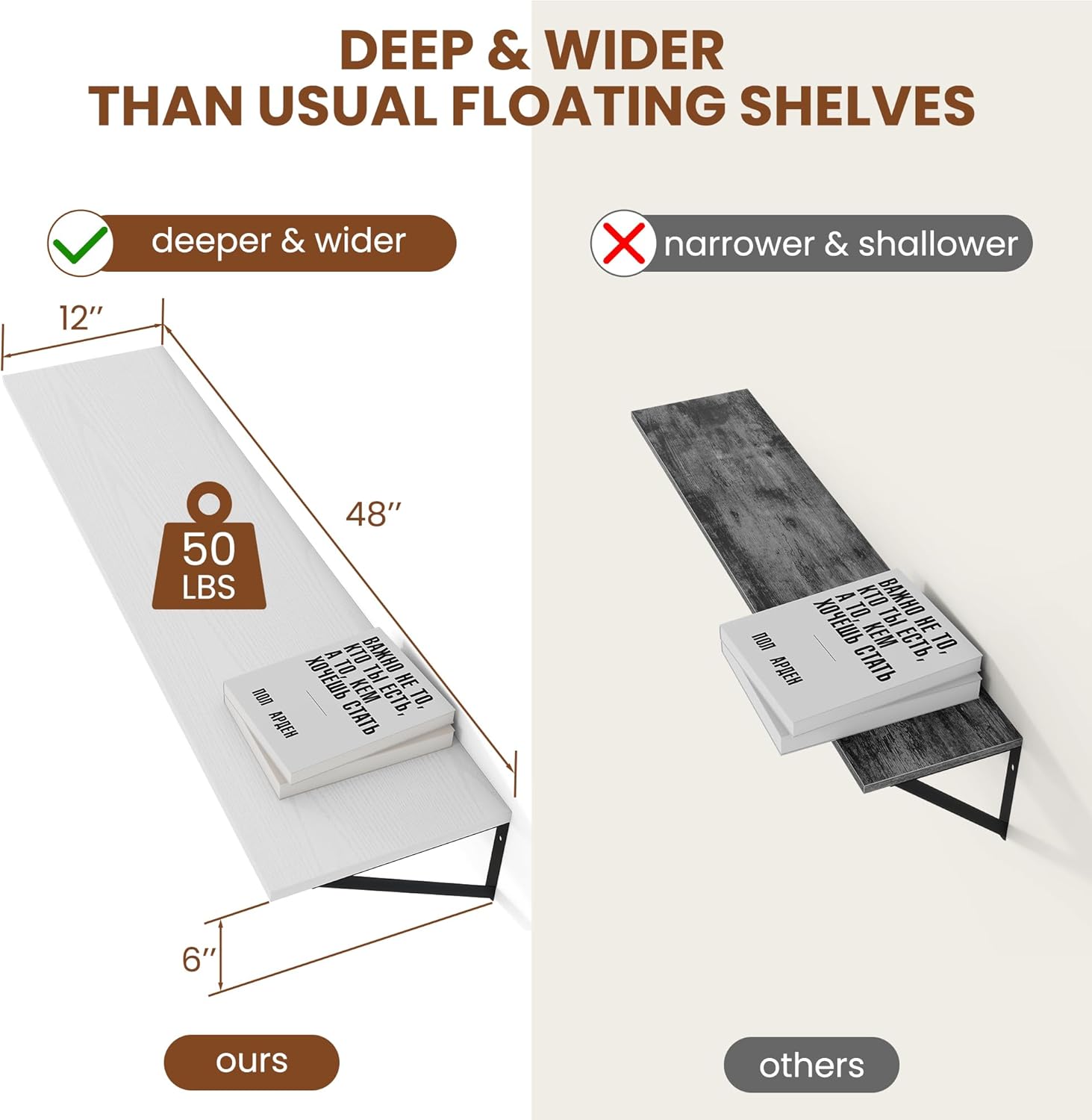 Heimlove White Deep Floating Shelves for Wall, 48W x 12D Wood Wall Shelves Set of 2, Wide Floating Bookshelf for Living Room, Kitchen, Office, Bedroom and Decor Storage, with Black Bracket - White
