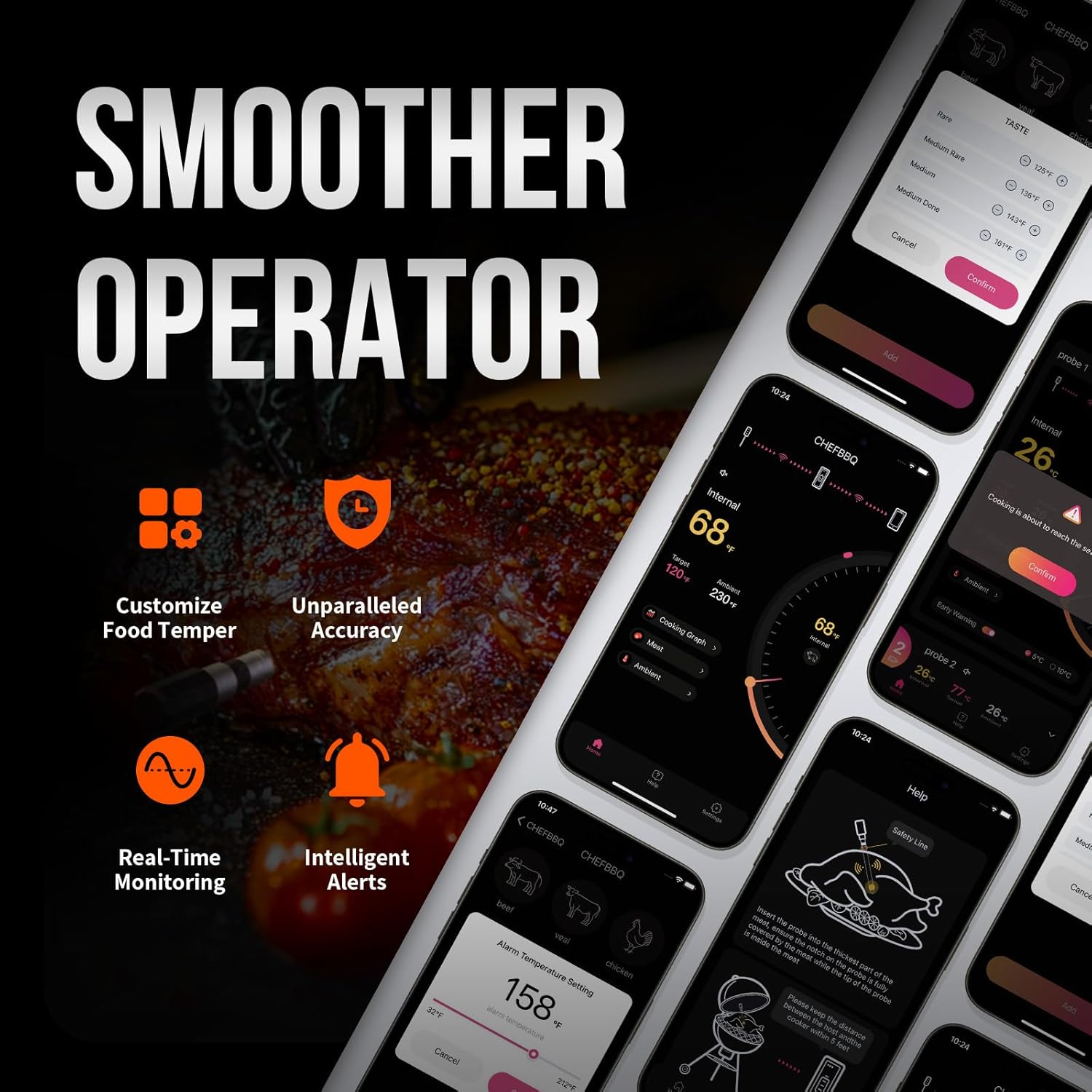 - 【USER-FRIENDLY CONTROL】CHEFBBQ app of digital meat thermometer offers preset temperatures for various meats and doneness levels. Early alerts prevent overcooking, ensuring a juicy, perfect cook every time. It's easy to read and operate