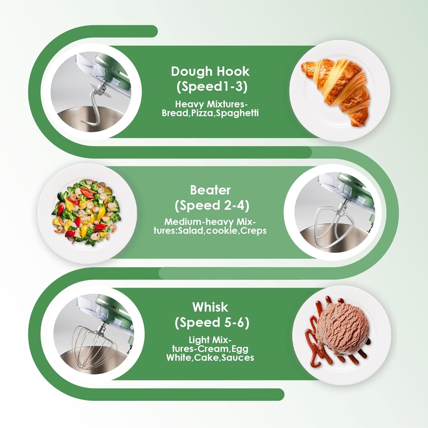 - 6 Speed, Easy to Use: This kitchen mixer features six adjustable speed settings and easy operation to meet your diverse mixing needs. The tilt-head feature allows for effortless switching between bowls and attachments.Its intuitive design ensures ease of use, making it ideal for both beginners and experienced bakers, delivering reliable performance for baking tasks.