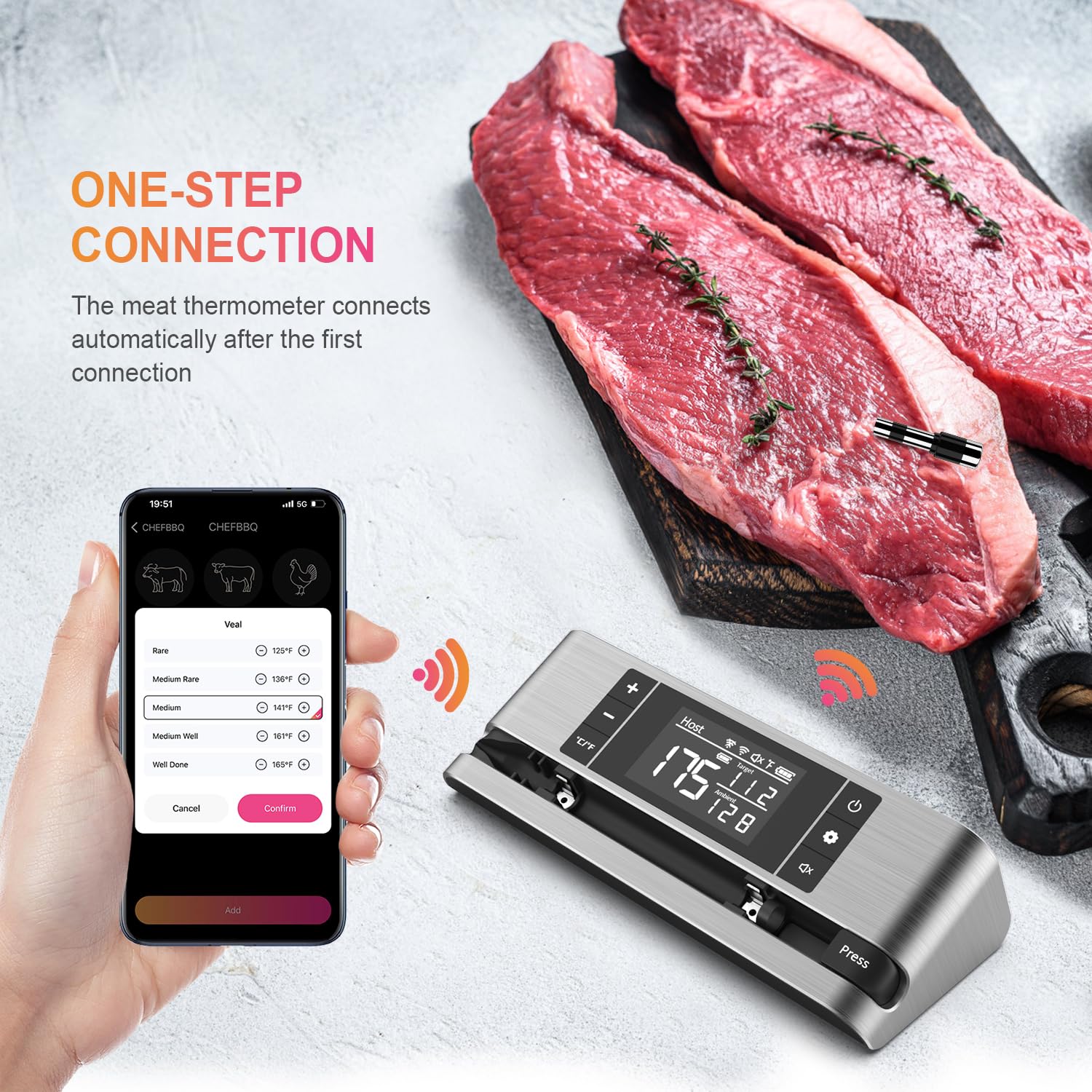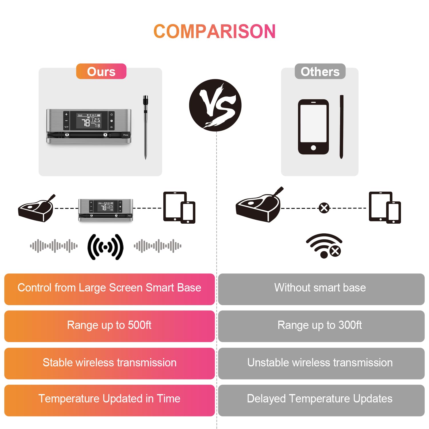 - 500FT Long-Distance Signal Transmission: The dedicated app connects wirelessly to the main unit, which acts as a signal relay between the probe and the app. This ensures a transmission range of up to 500FT, so you can monitor your cooking progress from the kitchen or backyard.