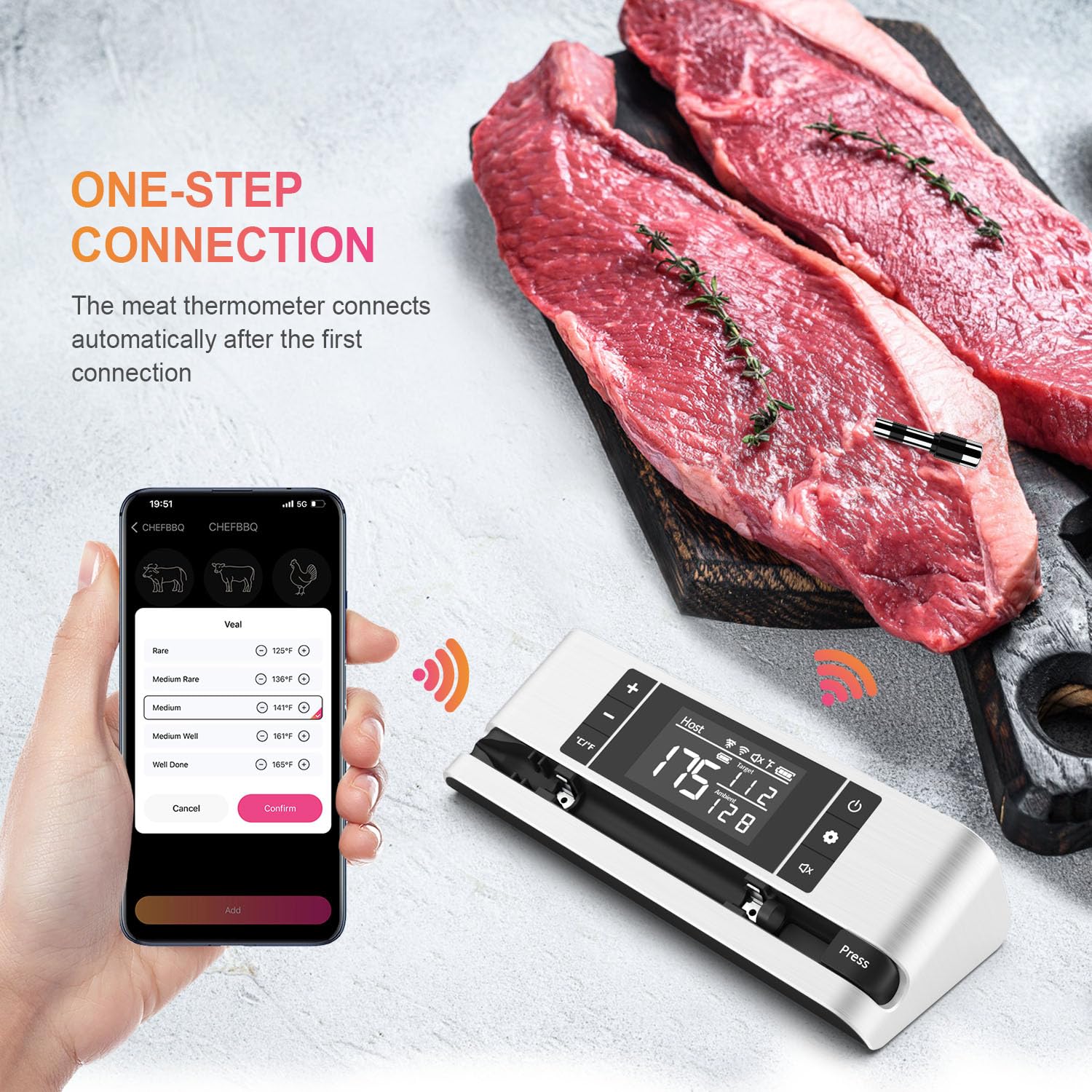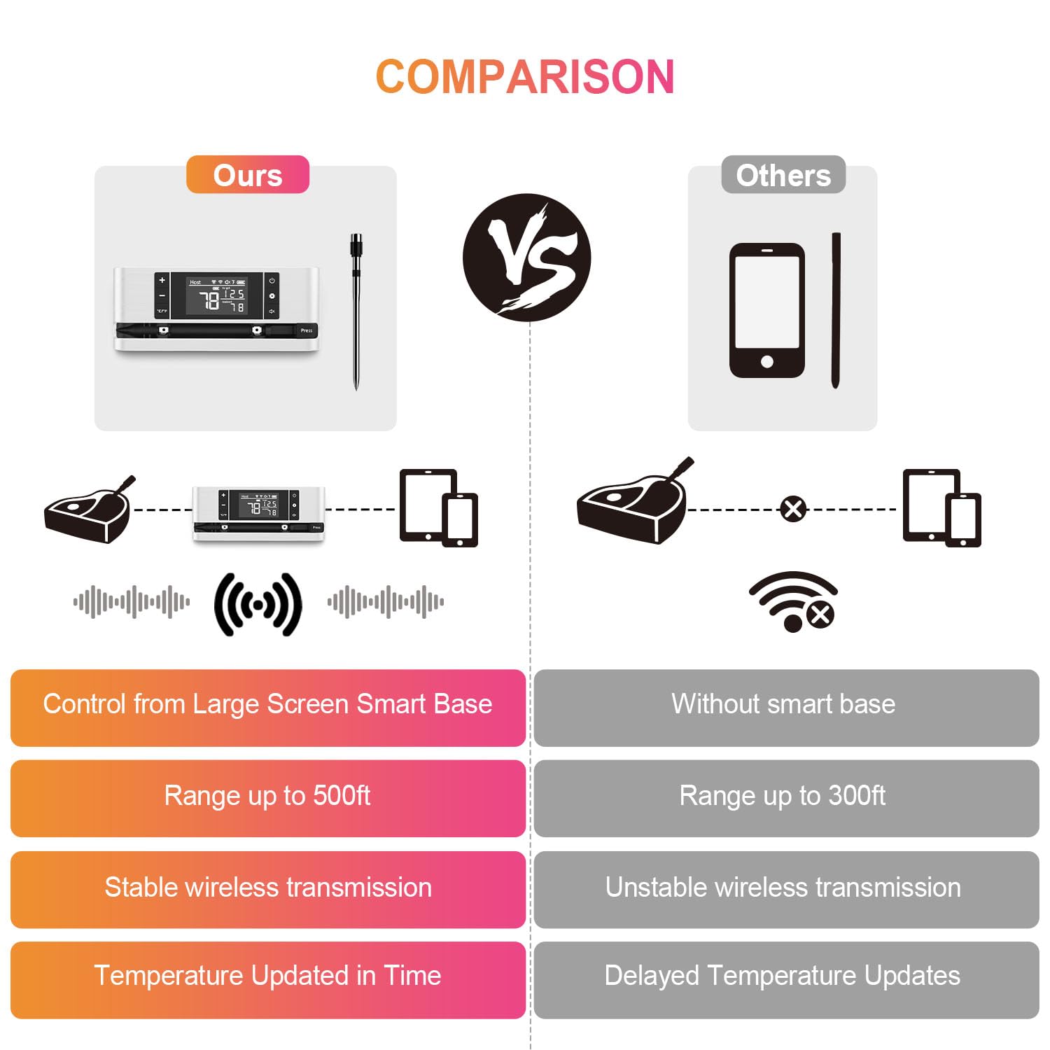 - 500FT Long-Distance Signal Transmission: The dedicated app connects wirelessly to the main unit, which acts as a signal relay between the probe and the app. This ensures a transmission range of up to 500FT, so you can monitor your cooking progress from the kitchen or backyard.