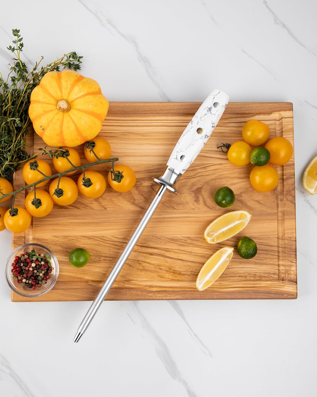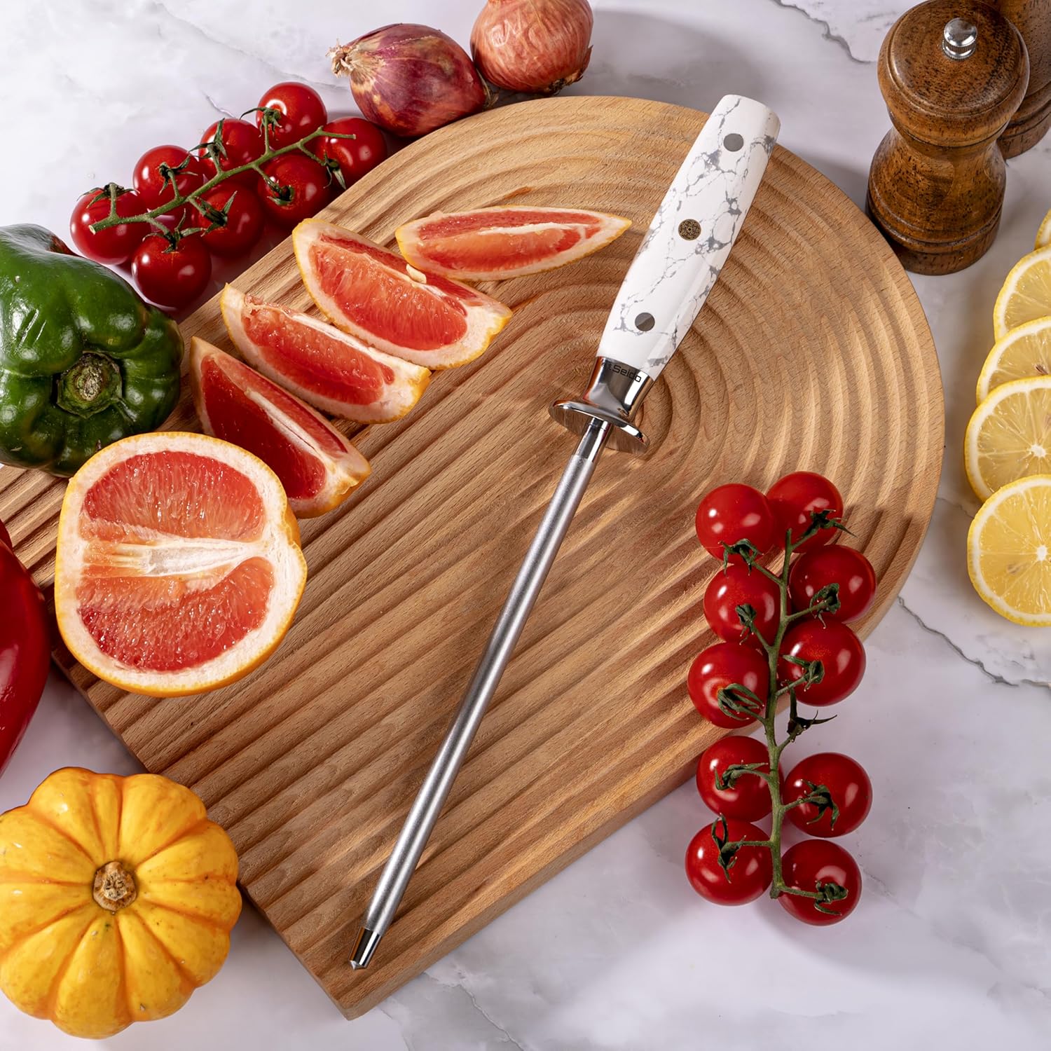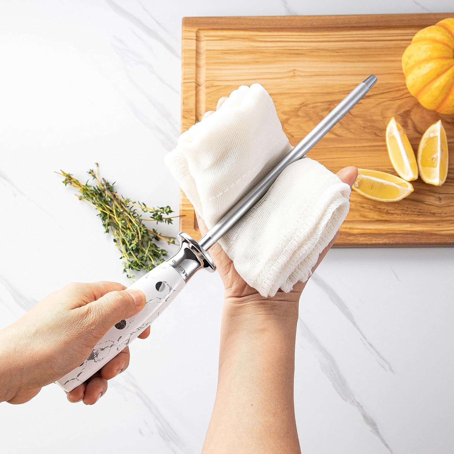 - Elegant Handle Design: Featuring a luxurious white turquoise handle with light grey marble accents, this sharpening rod combines practicality with a touch of sophistication, providing a secure and comfortable grip while enhancing your kitchen aesthetic.