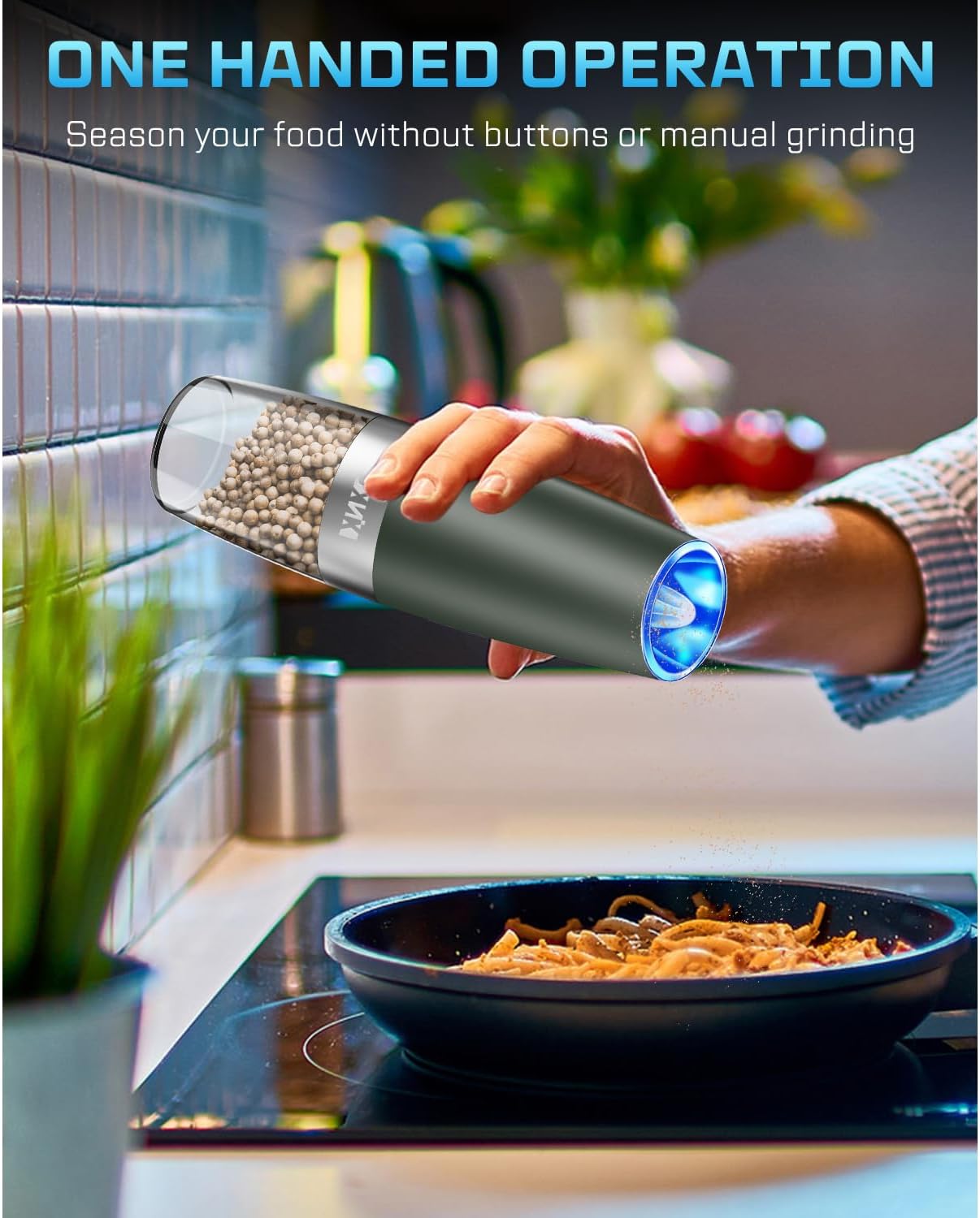 - 【BLUE LED LIGHT】 Just twist your wrist and the blue light of the electric grinder will light up. You can easily see the amount of Pepper and Salt in your food. The clear container on the grinder holds up to 2.8 oz of pepper or 6 oz of salt, about 7 TBSPs.Its large capacity means you won't need to add spices as often.