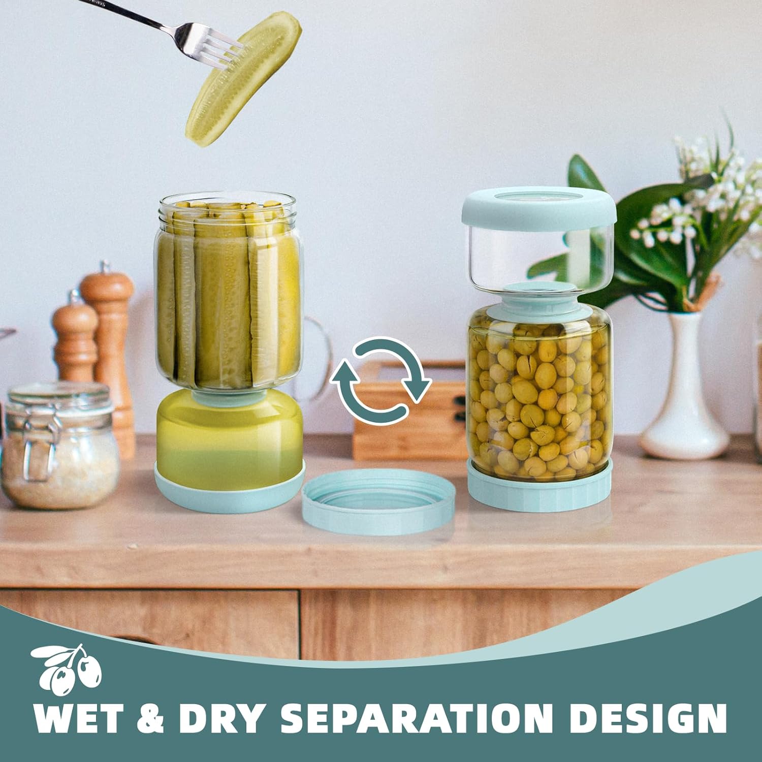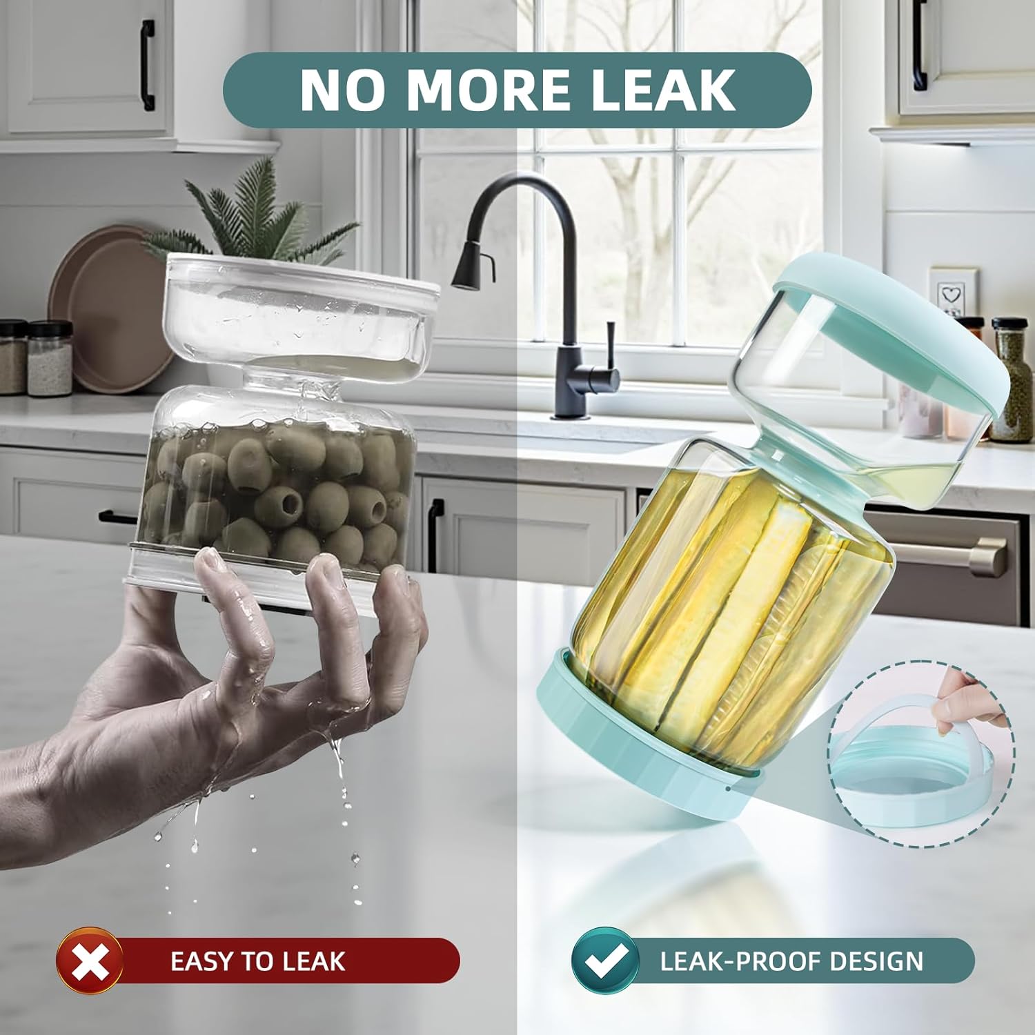 - 【DOUBLE LEAK-PROOF UPGRADE】The upgraded version of the pickle jar with strainer flip features a double leak-proof design. It has obtained the California 85 certification, which further guarantees its quality.The threaded design on the inside of the lid, coupled with a silicone sealing ring, ensures an airtight seal, keeping the olives delicious and fresher in the juice for a longer period.Ensuring the lid is tightly seated and the silicone seal is correctly fitted before flipping means no leaks.