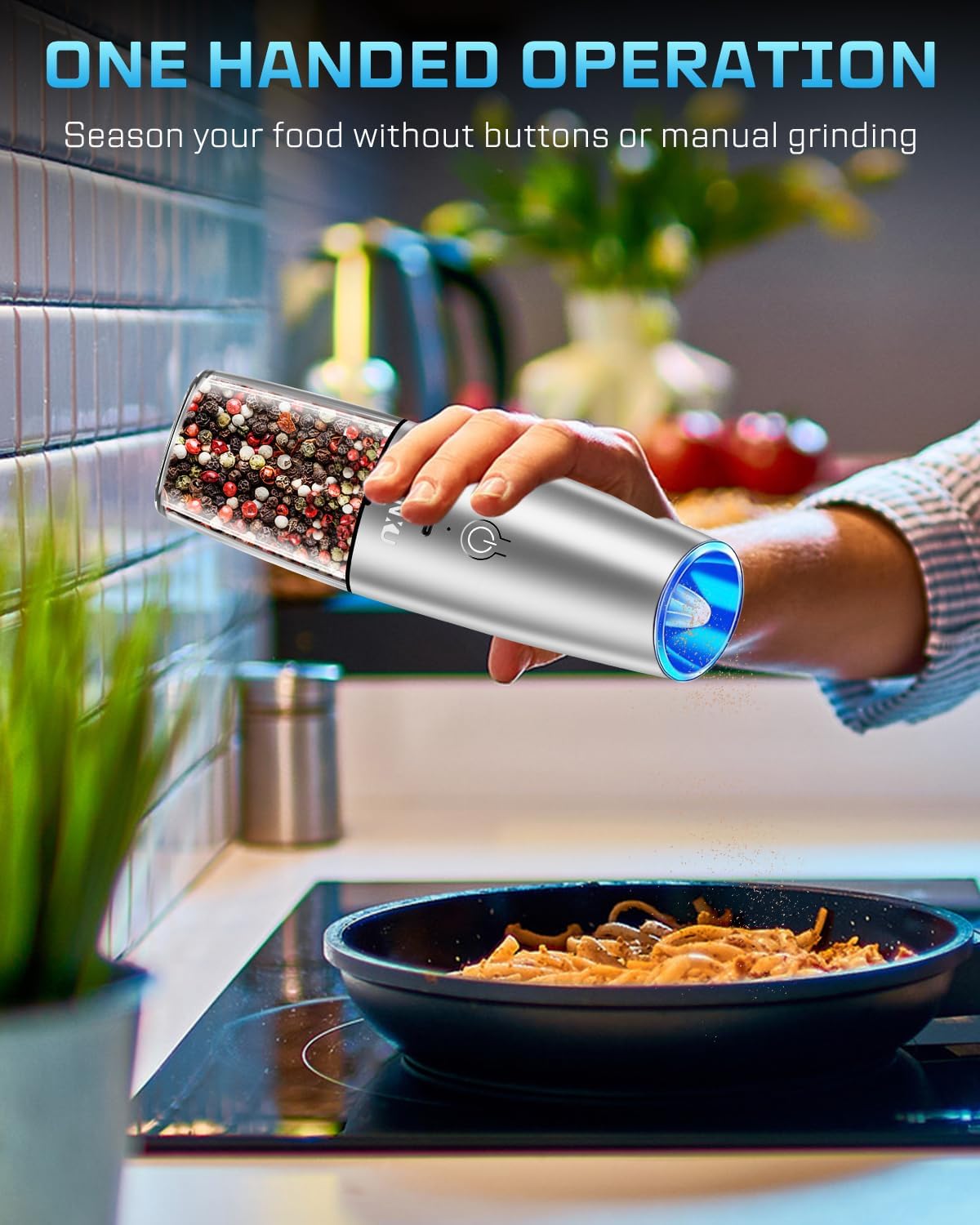 - 【Gravity Switch】 Our electric pepper and salt grinder comes with a gravity sensing switch, press the button and simply flip the grinder over to grind fresh spices, easy, convenient and fun. NOTE: Please turn on the automatic switch before use.
