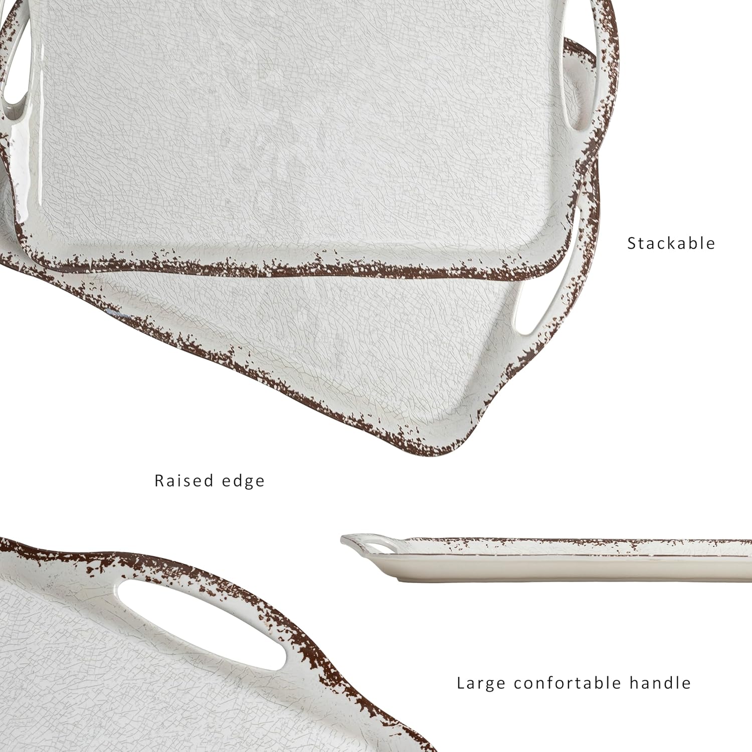 - BEAUTIFUL RUSTIC DESIGN: Designed with a crackled surface and rustic edge. Our Melamine serving tray is lightweight and break-resistant than ceramics and glasses, which has a delicate porcelain look and feel.