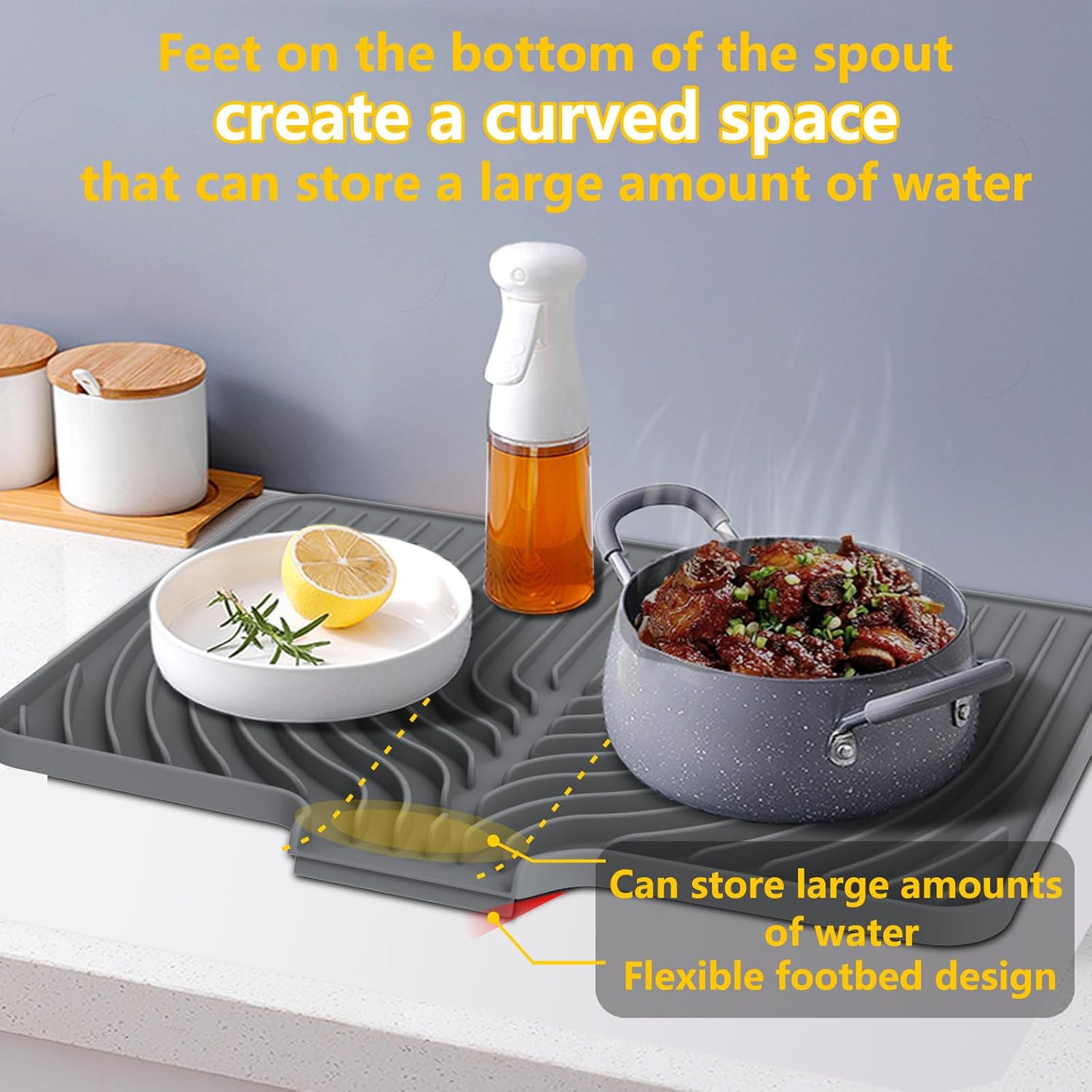 Silicone Drying Mat for Kitchen Counter, 18"×12" Silicone Dish Drying Mat with Board Drain,Rubber Kitchen Counter Dry Matt for Dishes Drying Rack(gray)