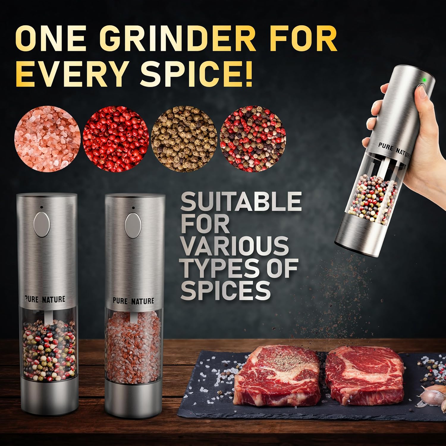 Pure Nature Salt and Pepper Grinder Set with rechargeable base. Premium Stainless Steel up-graded larger capacity with LED Lights, 5 Adjustable Coarseness, Refillable, Type-C Fast Charging.