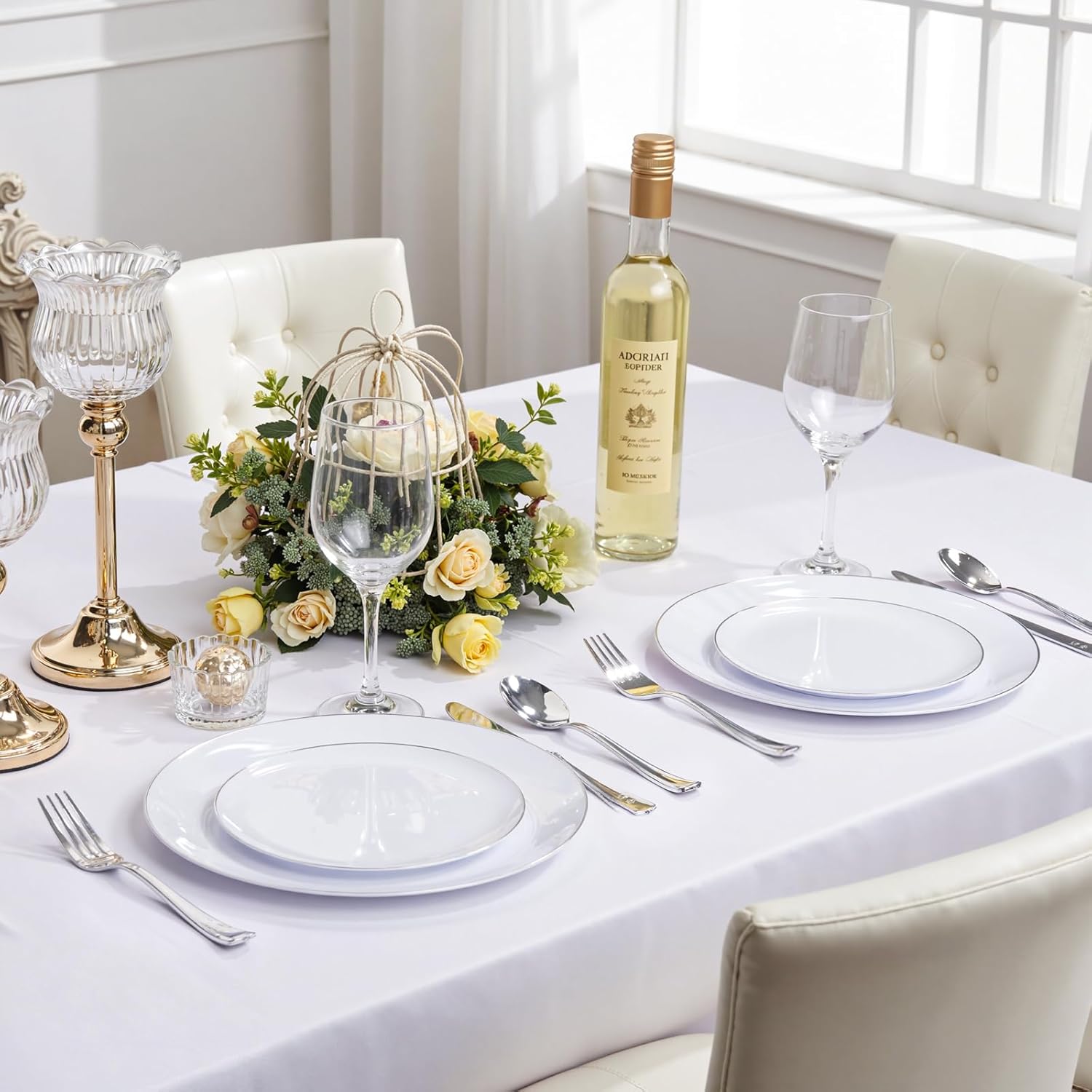 KIRE 200PCS Silver Plastic Plates - White Plastic Plates with Silver Rim Include 100 Dinner Plate and 100 for Dessert/Salad Plate for Birthday/Wedding/Party