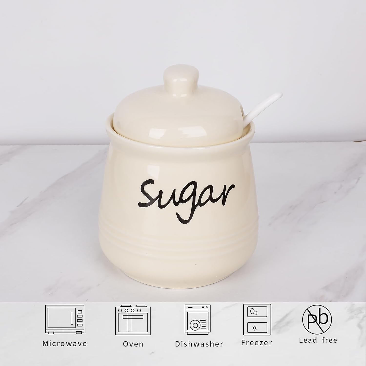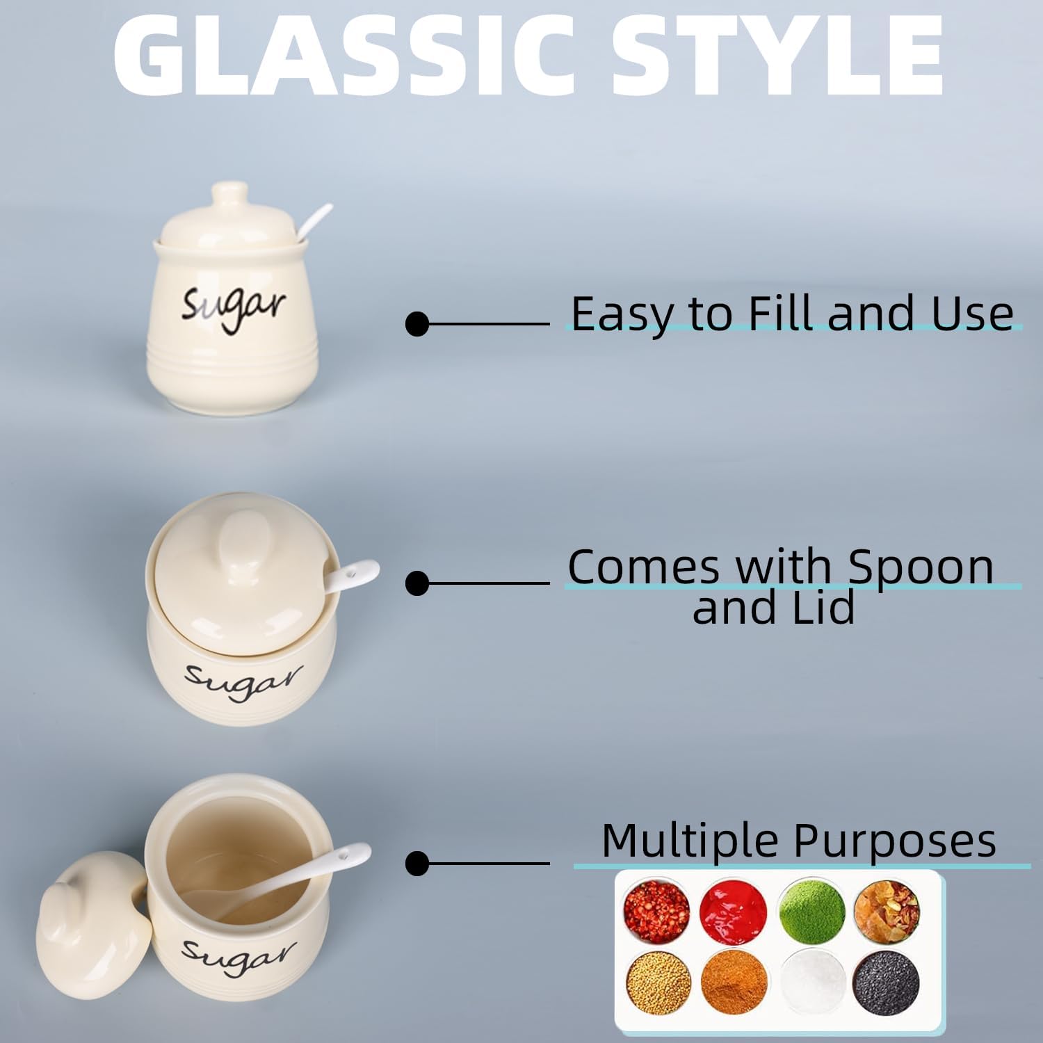 - DESIGN CONCEPT: This sugar bowl is equipped with a lid and a small spoon. The lid can keep your ingredients away from dust. There is a perfect notch on the lid for placing the spoon, so you don’t have to worry about placing the spoon randomly
