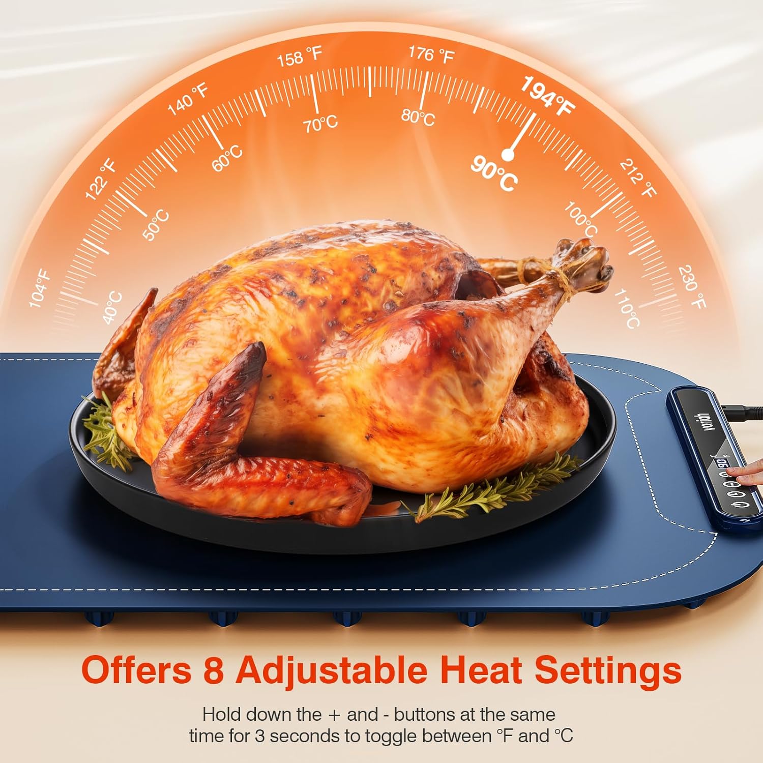 - 【8 Adjustable Temperature Levels (40–110°C)】Enjoy quick heating in just 10 seconds with 8 temperature settings to suit different foods. Whether it’s pizza, soup, or side dishes, this electric warming mat keeps everything deliciously warm for longer.