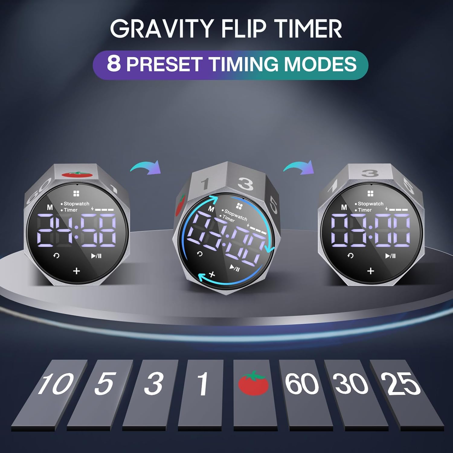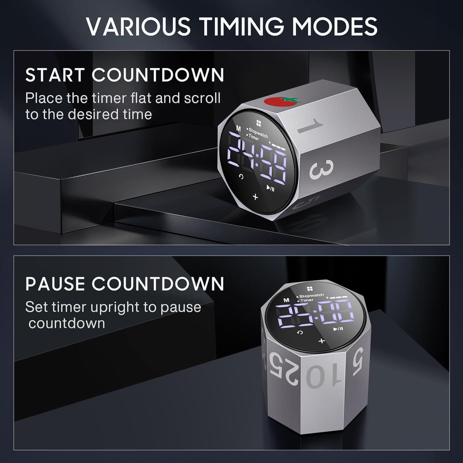 - 【7 timing modes】Productivity timer can set stopwatch and timer modes. The countdown mode has 7 preset durations (1/3/5/10/25/30/60 minutes) and a tomato time. Just roll it gently to start the timer, and lay it flat to pause it. In addition, you can customize any time to meet your needs, allowing you to efficiently manage your time throughout the day.