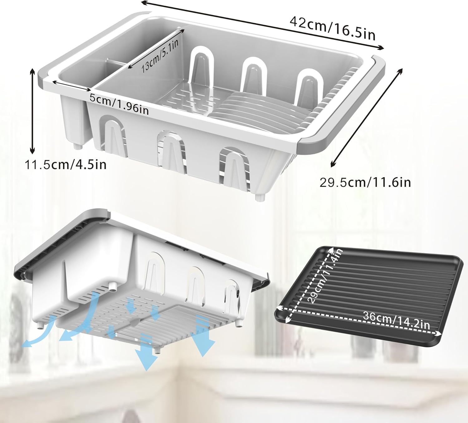 - [Extra Plastic Drain Tray] This dish drying rack is with an additional draining tray to collect and drain the water easily, making sure a neat and clean kitchen. It can be used separately to drain cups, bowls, plates etc. Or the food can be directly placed on it to dry after washing.