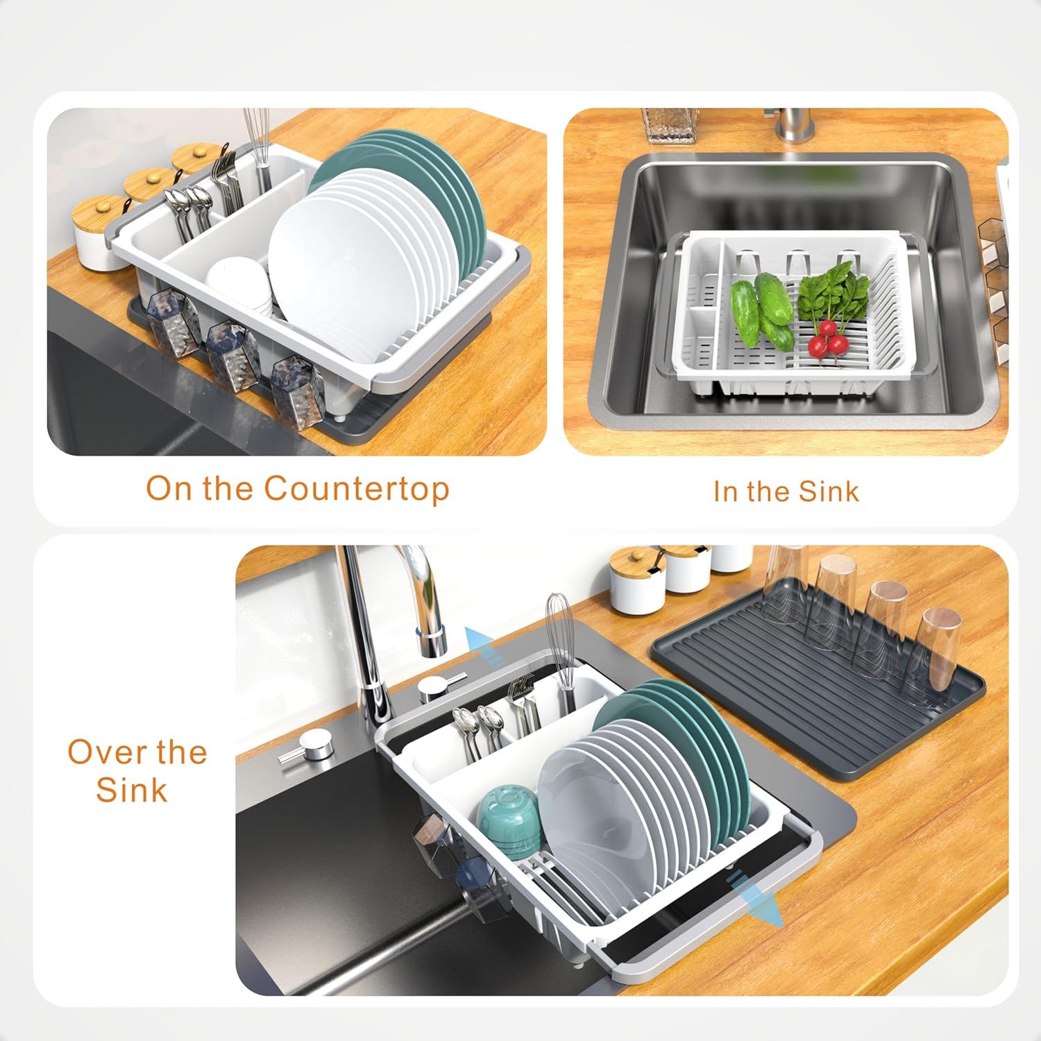 - [Heavy Duty Dish Drainer] Durable and sturdy plastic material preventing this dish drainer from rusting and can prolong its service life. The overall dimensions are 16.3”-20.3’’L x 11.6”W x 4.3”H, with extendable handles (16.3" to 20.3") to fit in most kitchen sinks. this dish drainer No need assembly and No tool needed.