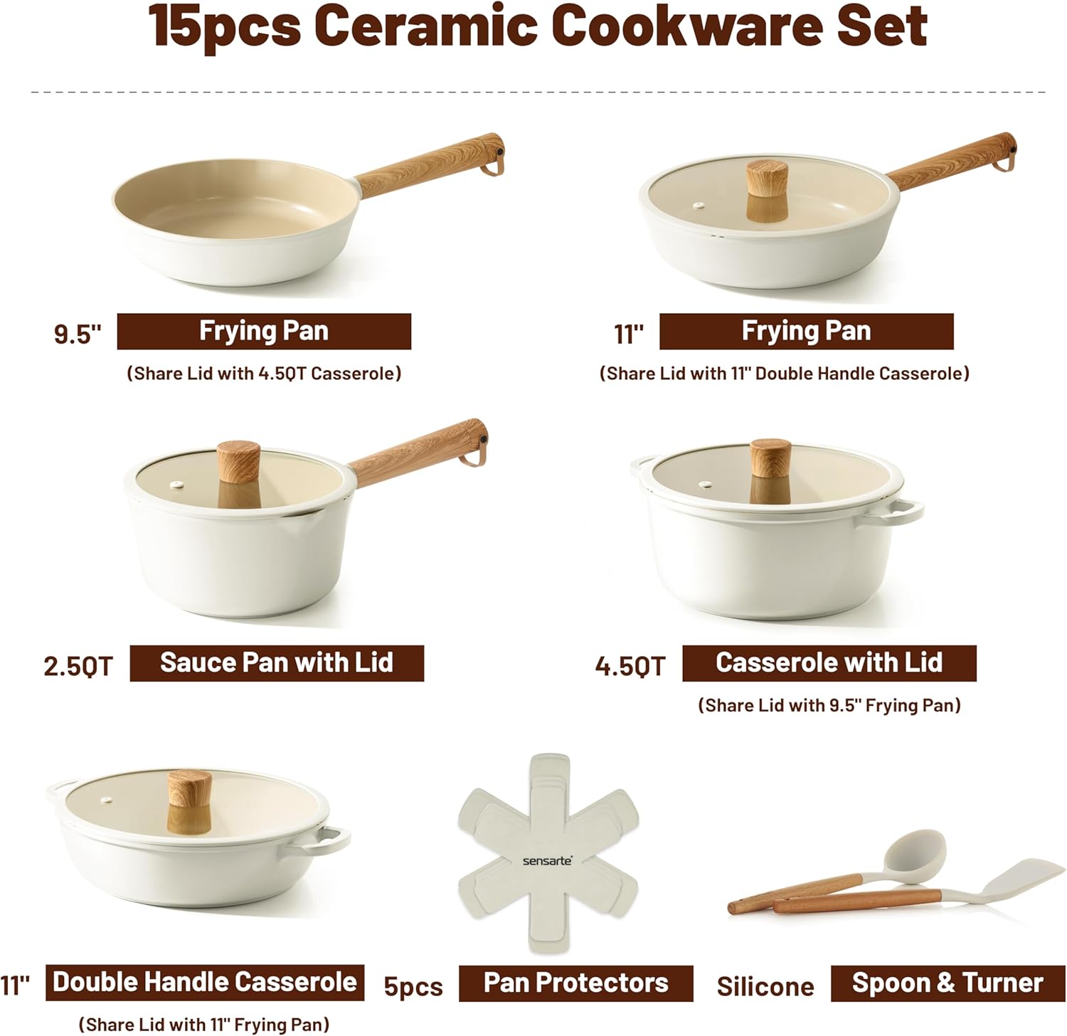SENSARTE Ceramic Nonstick Cookware Set Non-toxic Healthy Pots and Pans Set Ceramic Coated Kithchen Cooking Set, Free of Intentionally Added PFAS/PTFE, Dishwasher&Oven Safe, Induction Compatible, 15pcs