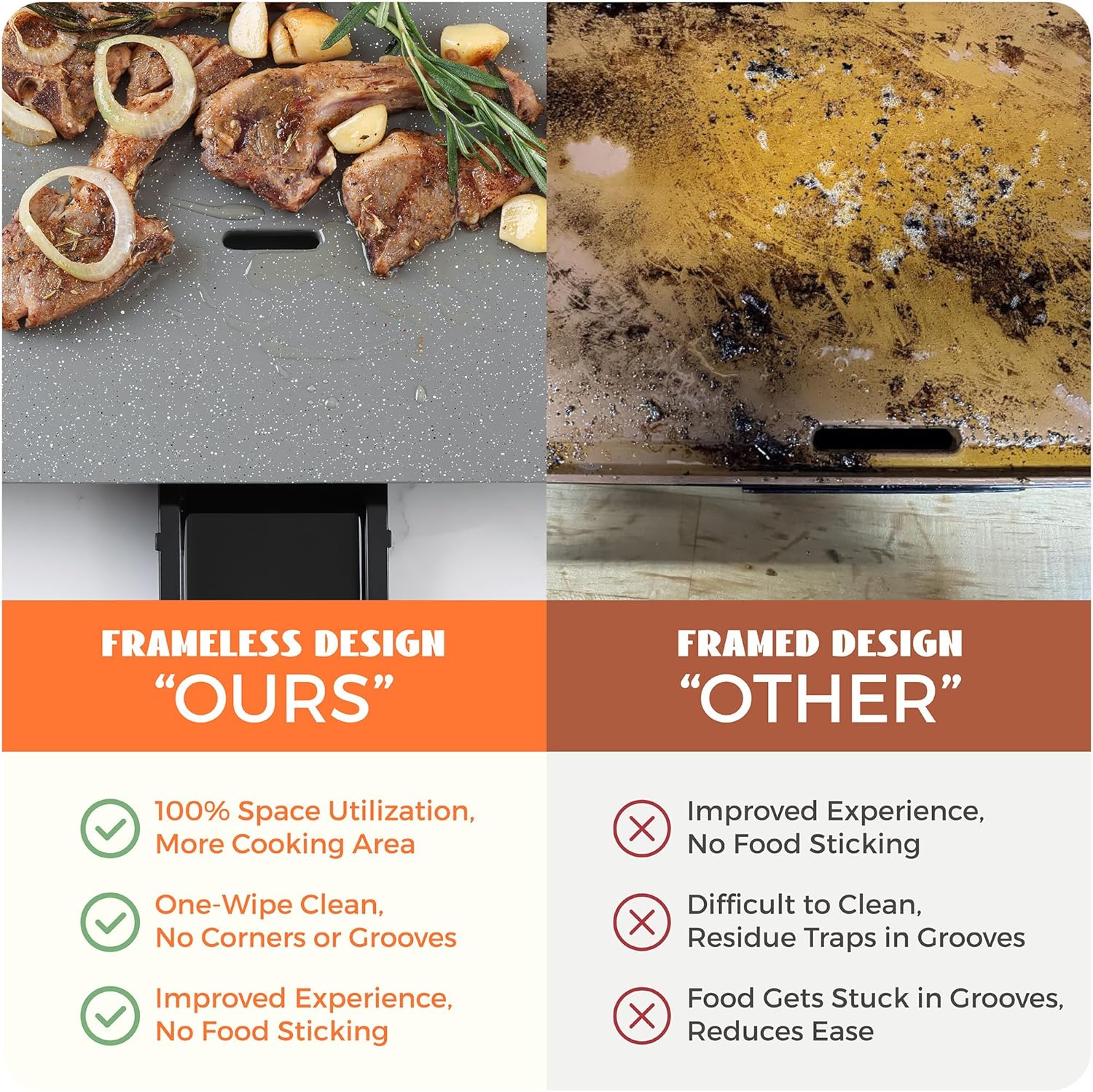 - Sloped Cooking Surface:Enjoy 45% less grease, as the sloped design drains grease automatically and directs excess fat away from your food, leaving you with a healthier meal