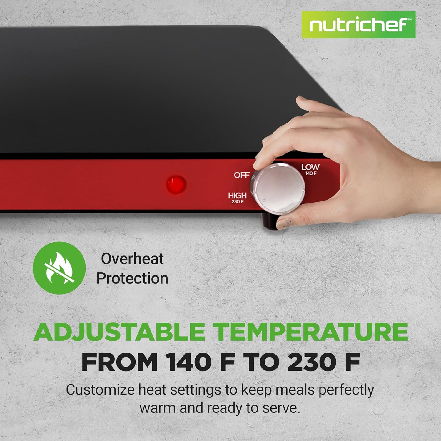 - OVERHEAT PROTECTION AND NON-SLIP FEATURE - This electric heating tray features overheat protection and non-slip feet, ensuring safe operation on any countertop. Its intuitive controls and even heat distribution guarantee a safe warming experience.