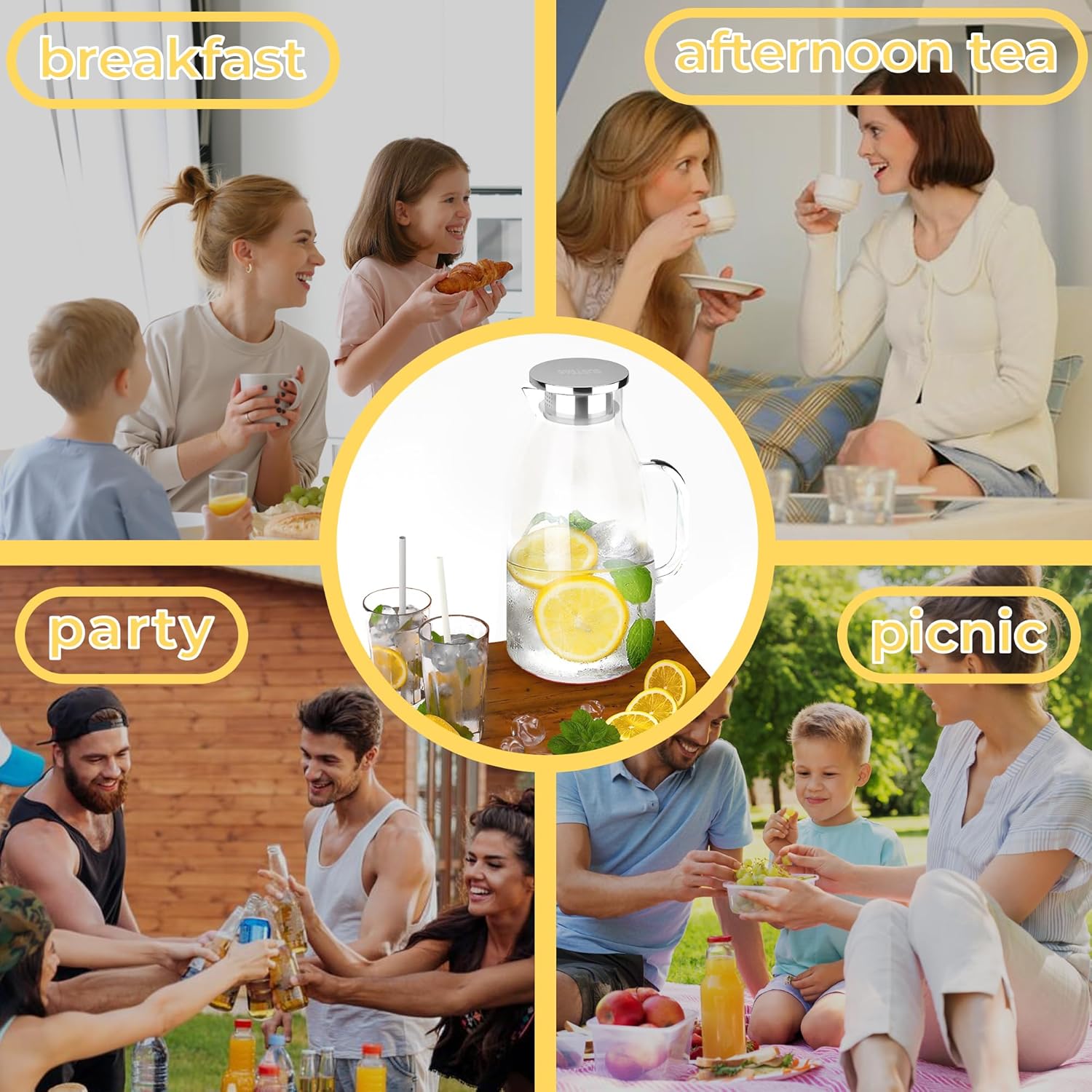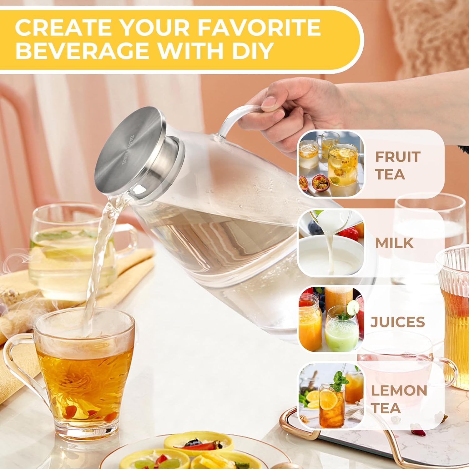 - Healthy Drinking And Long Lasting: Our glass water jugs are both strong and lightweight, made of heat-resistant borosilicate glass, the glass jugs are thicker than ordinary glass jugs. It can withstand temperatures from -20°C ~ 150°C/-4°F ~ 302°F. Its lead-free and BPA-free construction makes it a healthier choice for everyday use - keeping drinks fresh and flavorful for longer