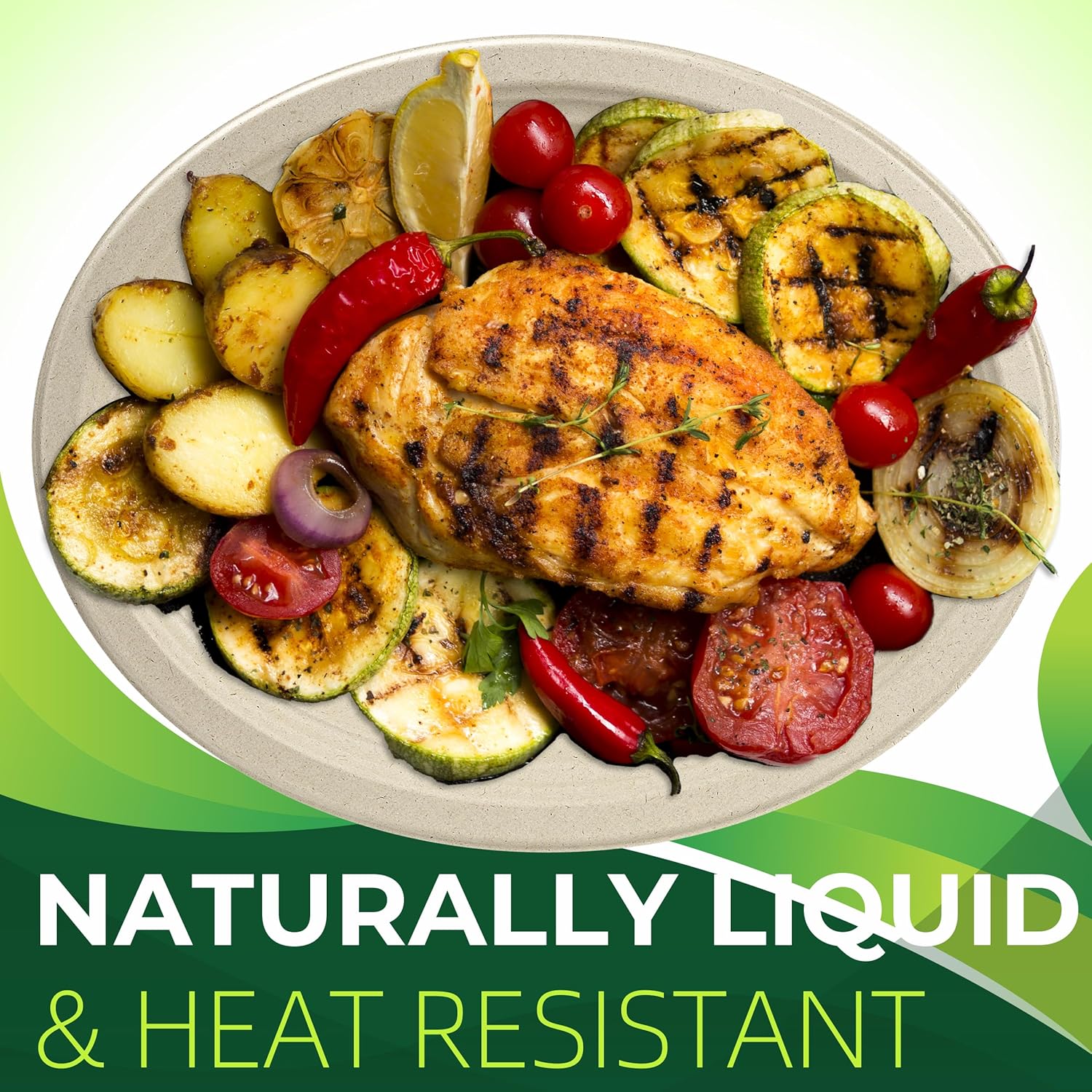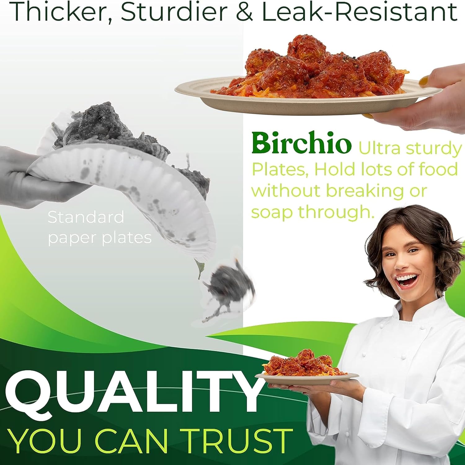 - 🌿 【Thicker, Sturdier & Leak-Resistant】- Our unique process mixed Bamboo and Bagasse to create heavy-duty compostable plates you will love! Bamboo has natural strength and liquid resistant characteristics that help provide superior strength and reduce unnecessary leaks. They can even handle the messiest food items thanks to the oil proof design. The wide rim design allows you to serve saucy foods on the plate without worrying about spills and messes.