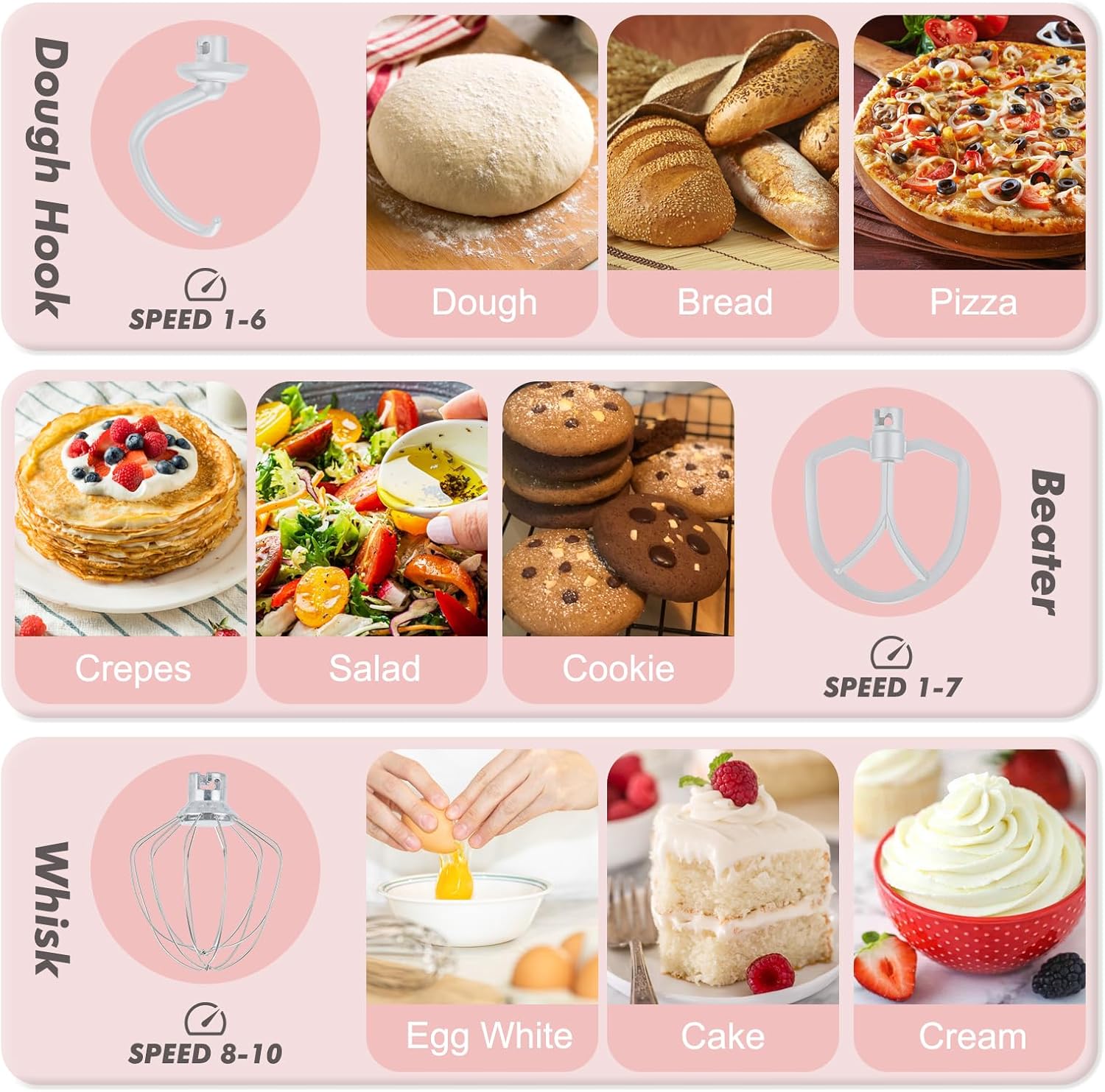 - 10 Speeds and Tilt Head Design - This small kitchen mixer has 10 different speed options,suitable for mixing bread dough, thick batters, meringues, and whipping cake cream, plus lower speeds for stirring and finessing your most delicate concoctions,could suit perfectly to different ingredients. Tilt-head design mixer allows access to install or uninstall bowls and accessories easily.