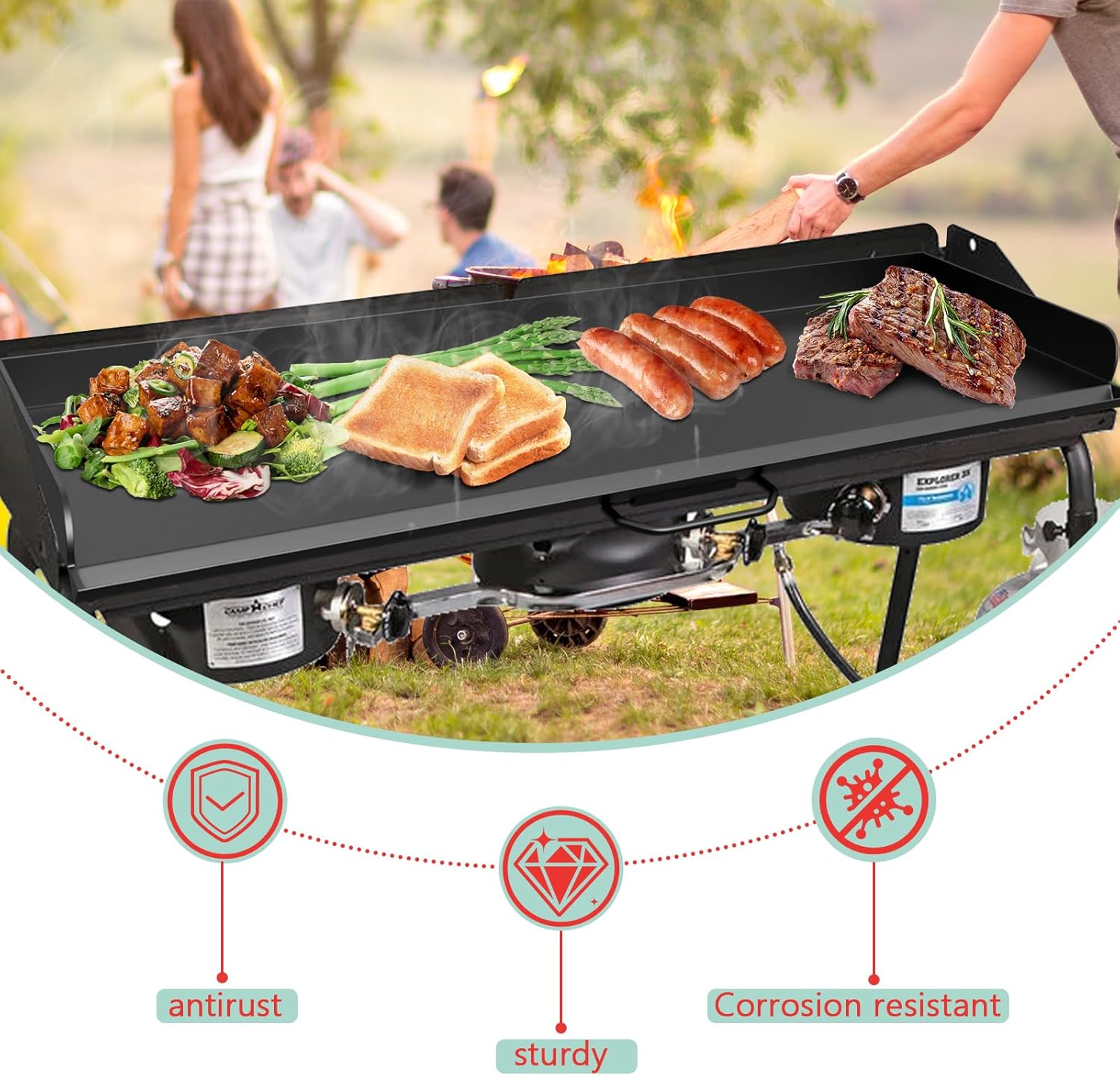 - MORE SPACE: The large cooking area is large enough to cook any food, allowing you to achieve more enjoyable cooking, put your favorite food on top of the camping griddle, cook more food in less time, ensure even heat distribution, but also have the effect of heat preservation, to ensure that the food flavor while ensuring that your cooking experience!